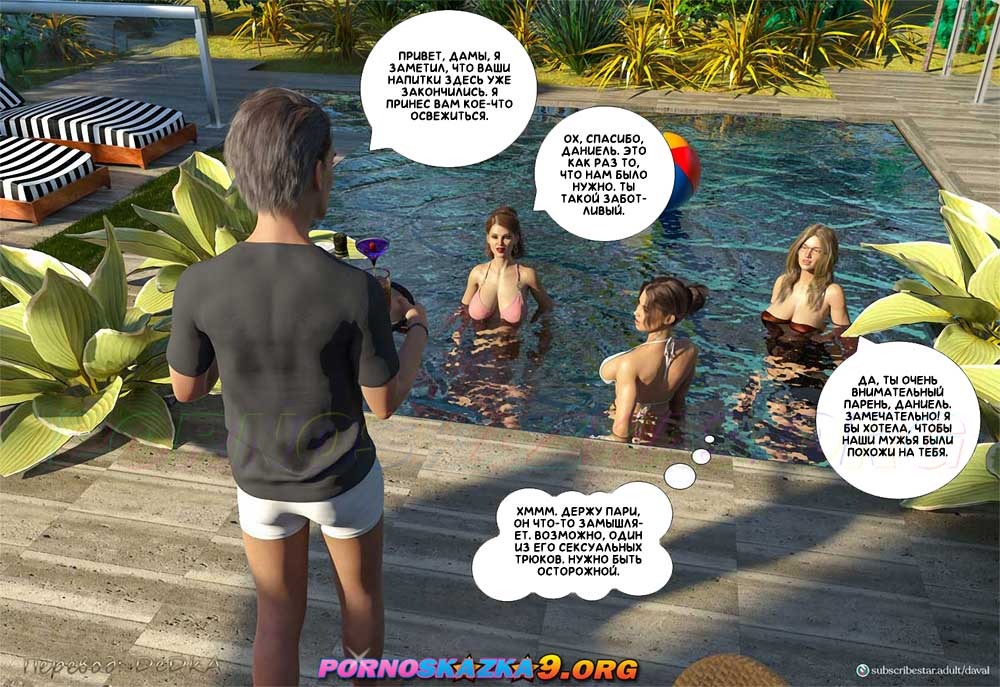 Секс комикс Непристойные желания мамаш. Часть 6. Даниэль ловко выбрался из кабинки женского туалета, где он жестко имел Лану, но он тут же попался на глаза двум сексуальным девушкам, у которых возник вопрос о том, что он вообще делает в женском туалете?