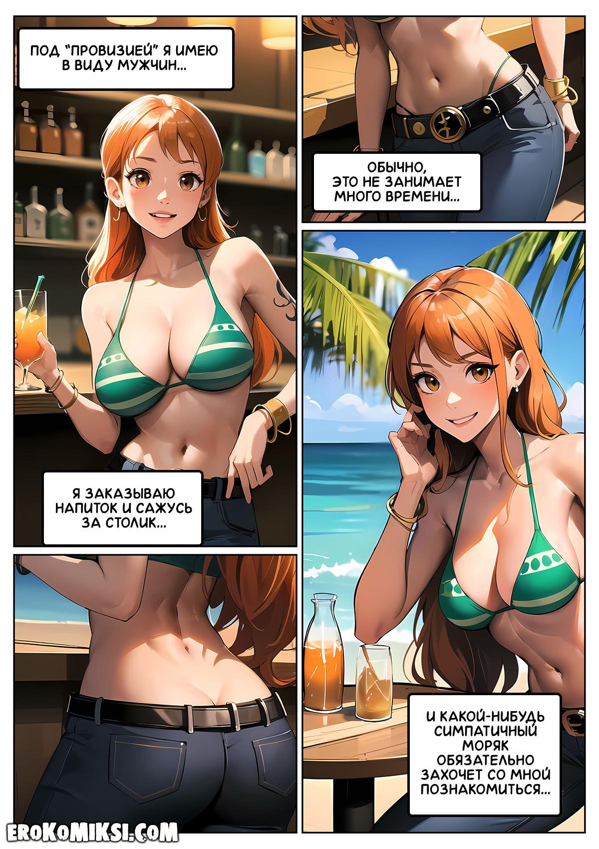 Секс комикс One Piece. Женские потребности Нами. Каждый раз, когда корабль Нами заходит в порт, красавица отправляется в бар, где подцепляет парня, а иногда и не одного, чтобы они как следует оттрахали её тугую киску и удовлетворили её сексуальные потребности…