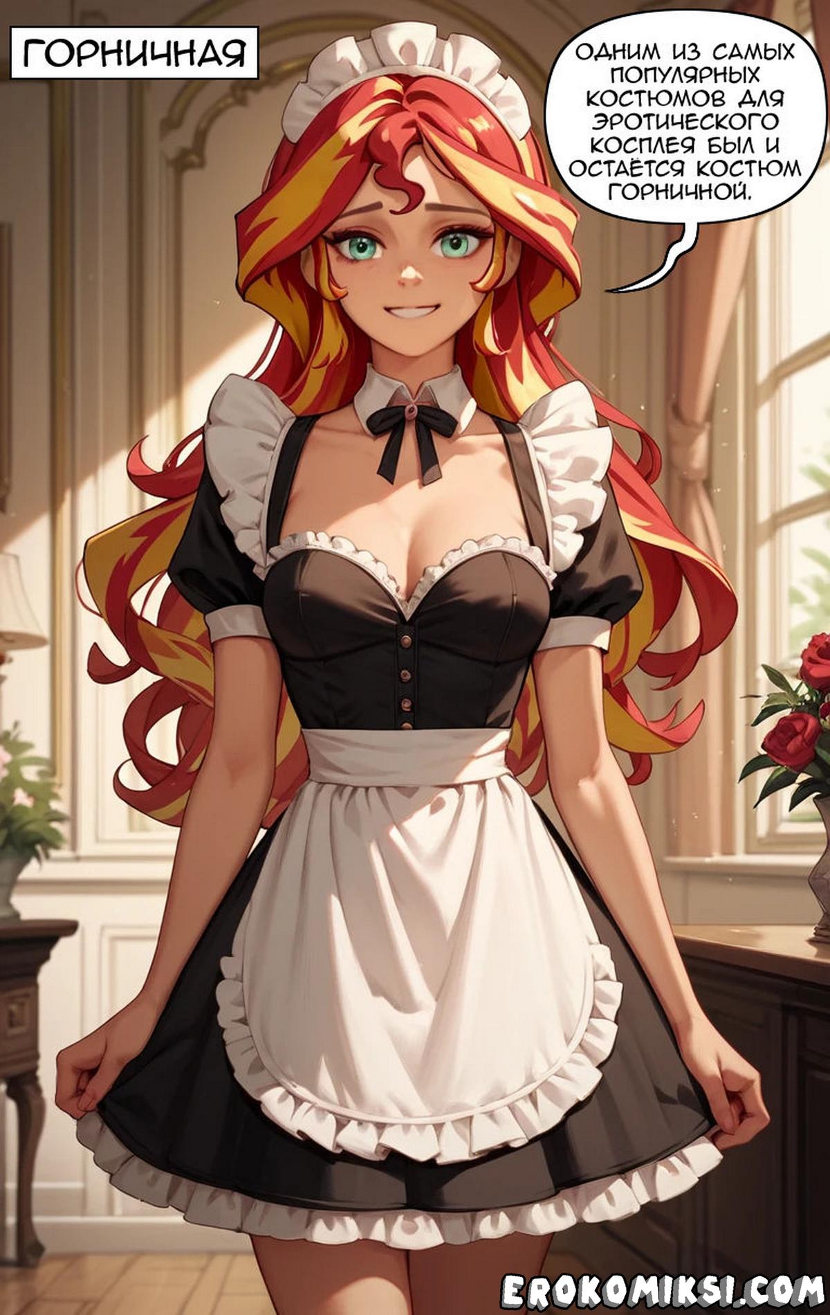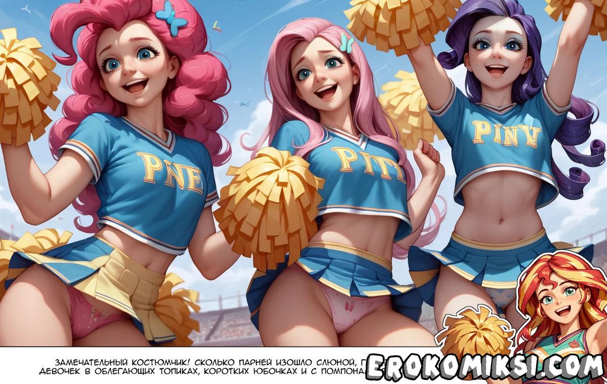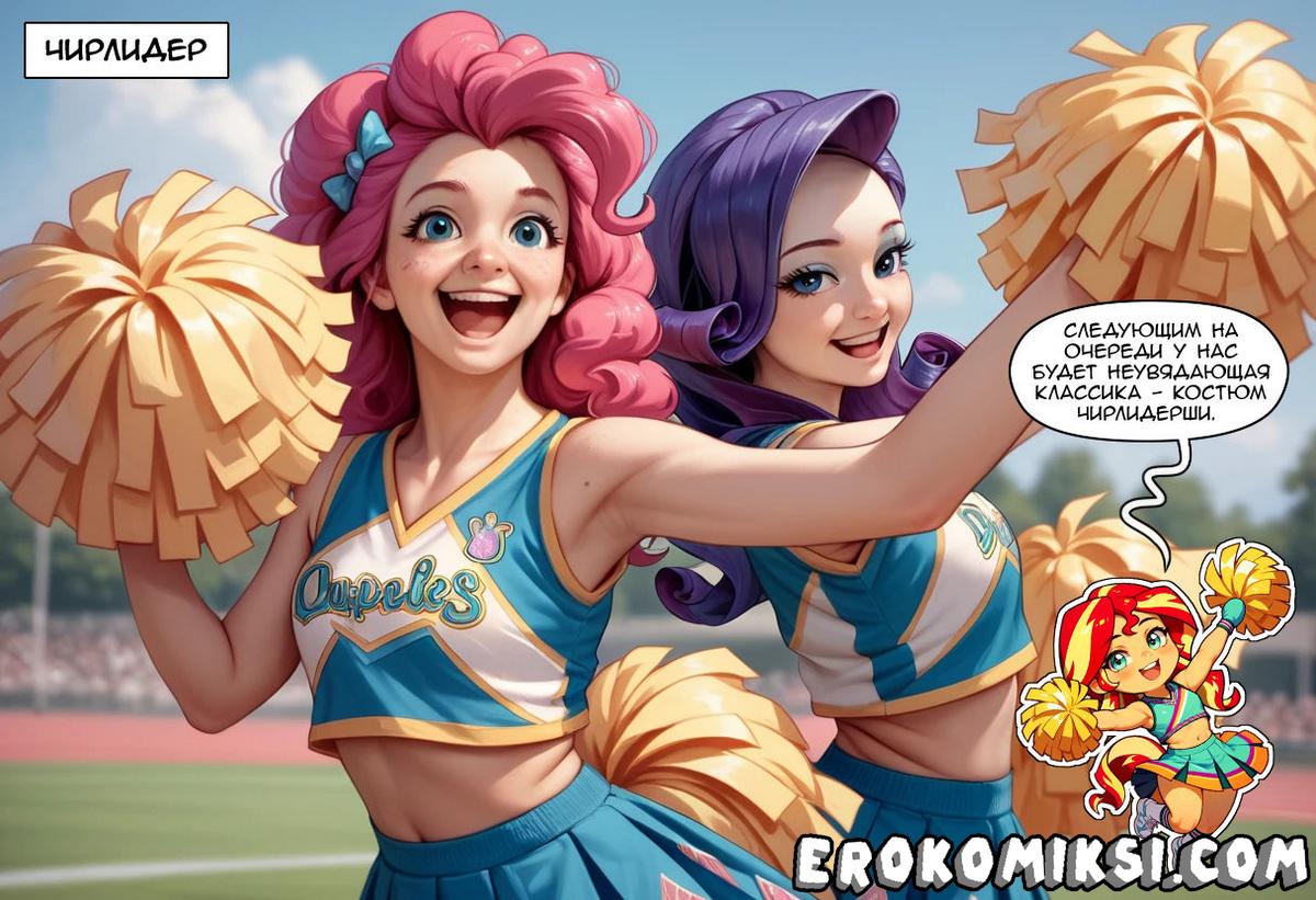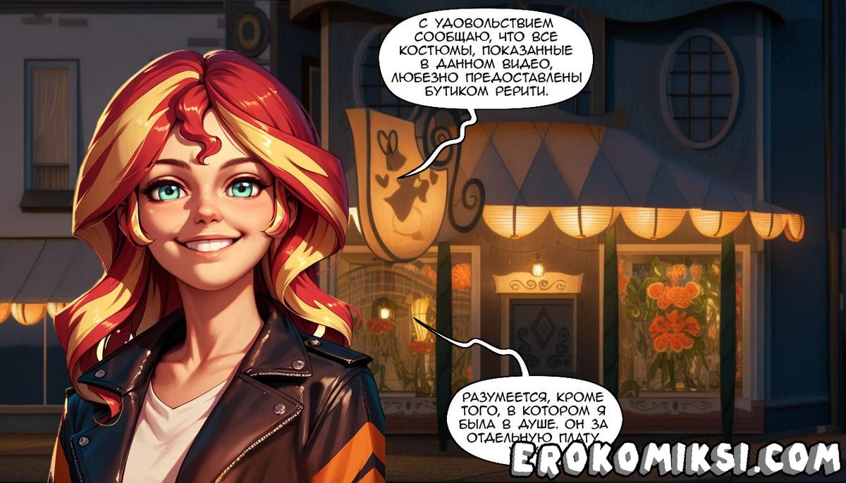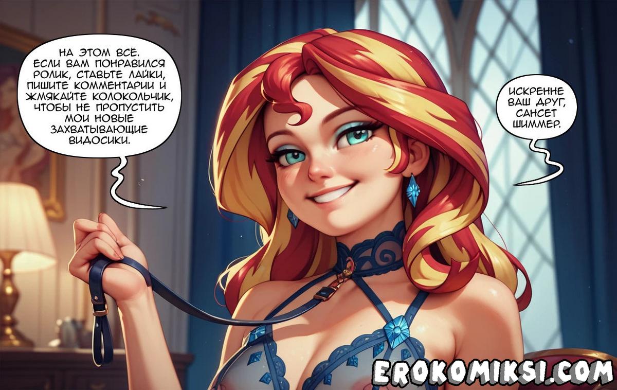 Секс комикс Подписывайтесь на канал Сансет Шиммер. Сансет Шиммер решает сделать программу, посвящённую эротическому косплею для своего канала Шиммер-класс. Девушки соглашаются помочь подруге в демонстрации изготовленных Рерити костюмов, попутно открывая некоторое из своих секретиков. Например, мы узнаем, какой тайный ингредиент добавляет Пинки Пай в свои кексики, почему у Эпплджек никогда нет проблем с набором сезонных рабочих на ферму, как Рейнбоу Деш поддерживает боевой дух Вандеркольтов и так далее. Даже директор Селестия не прочь поучаствовать в создании передачи. Так что подписывайтесь на канал Сансет Шиммер, ставьте лайки, пишите комментарии и жмякайте колокольчик, чтобы не пропустить новые захватывающие видосики. P.S.
