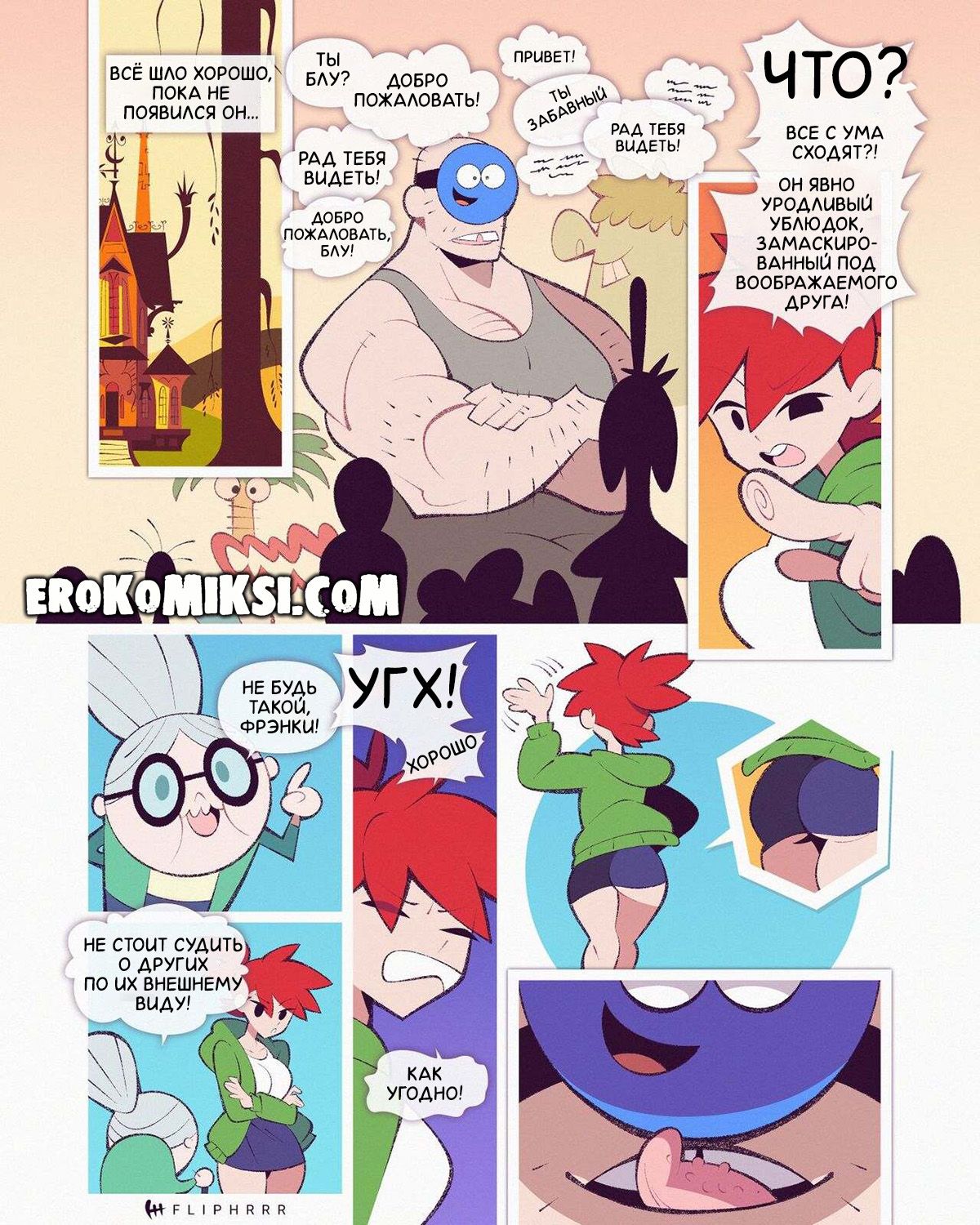 Секс комикс Принуждение БЛУ. Фрэнки шла по улице и увидела, как все восхваляют уродливого парня, Блу. Она прокричала всем, что те безумцы и зачем они восхваляют этого урода. Блу угостил Фрэнки специальной печенькой, от которой у Фрэнки сорвало башню. Она сбросила с себя одежду и начала сосать у урода…