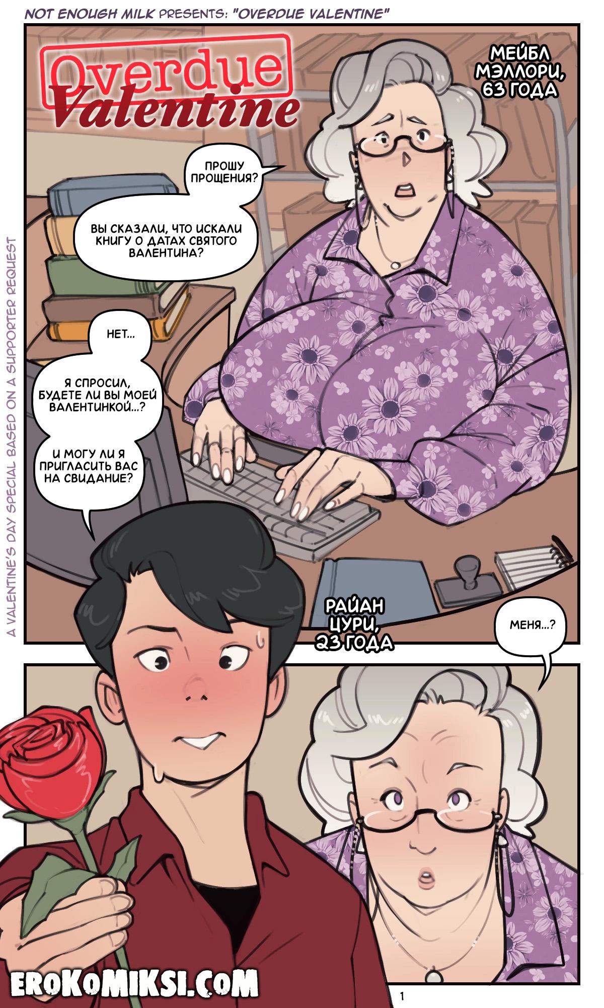 Секс комикс Просроченная валентинка. Парнишка каждый день ходит в библиотеку, так как ему нравится старая библиотекарша и он приглашает её на свидание. Смущённая старушка соглашается с ним поужинать, а после ужина они отправляются к ней домой, где паренёк как следует трахает старушку…