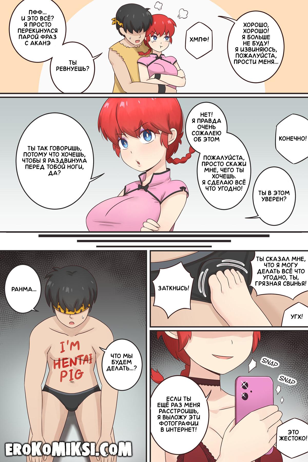 Секс комикс Ранма. Соперники-Любовники. Часть 2. Ранма отсасывает Рёги, но резко останавливается, оставляя парня неудовлетворённом, так как Ранма ревнует Рёги к другим девушкам, но Рёга убеждает её, что это просто общение. Тогда Ранма фотографирует голого Рёги, у которого на теле надпись “Я грязная свинья” и теперь, если он вновь будет флиртовать с другими девушками, то Ранма выложит это в Интернет. Затем они снова трахаются…