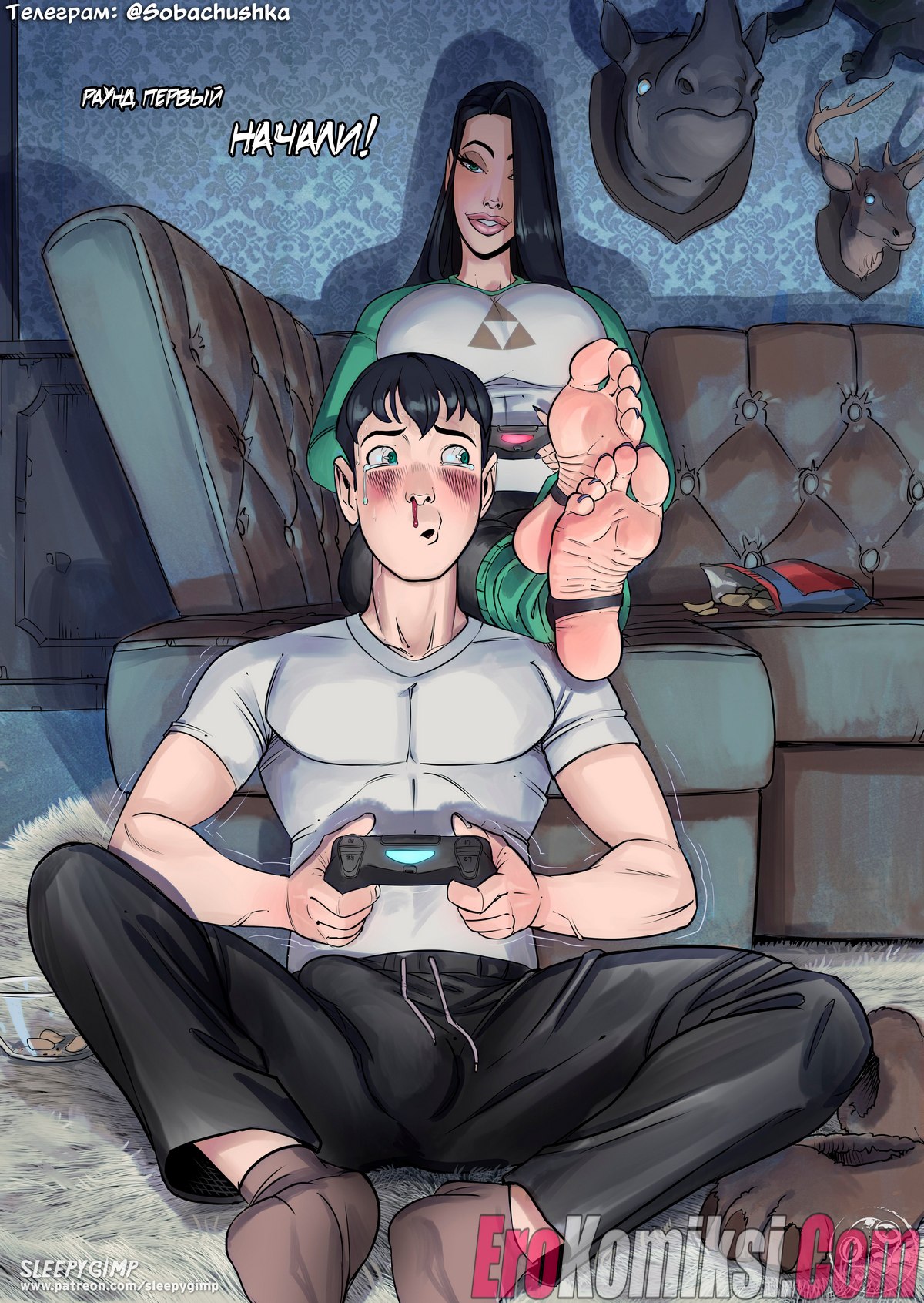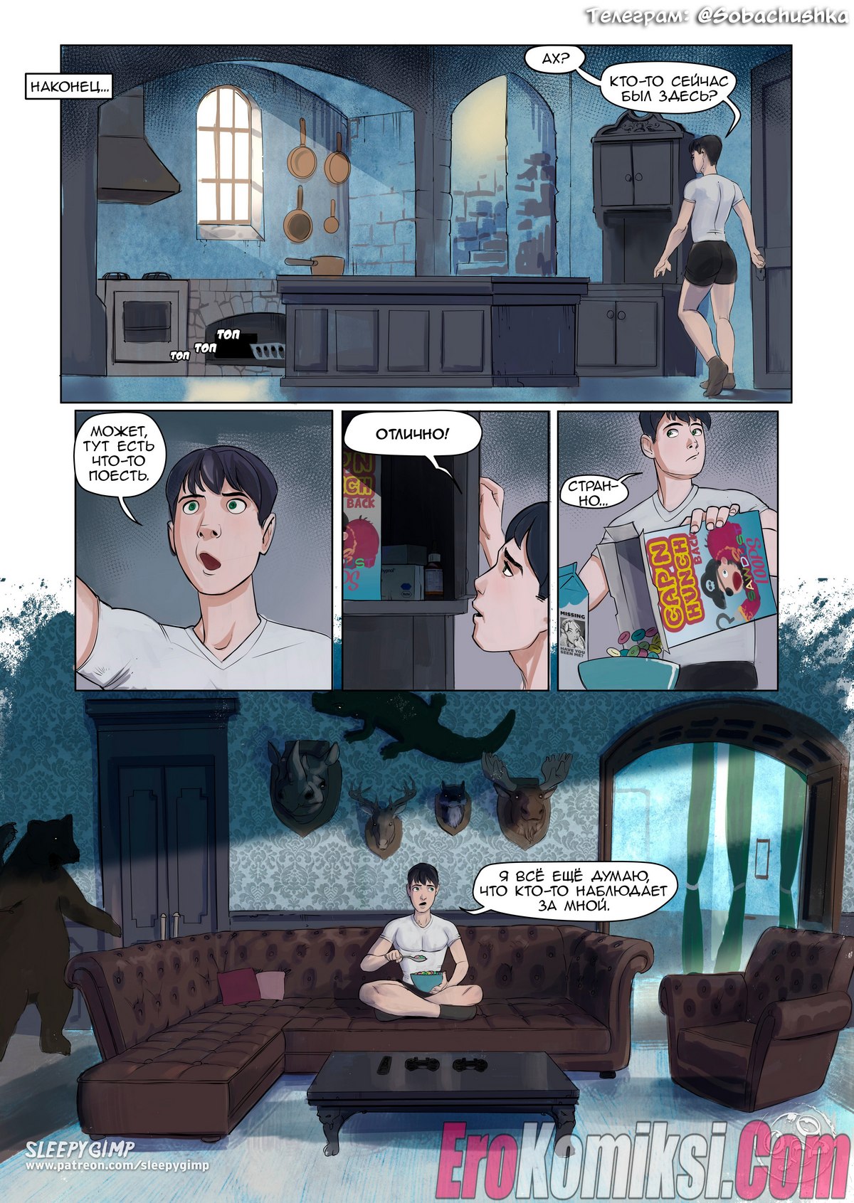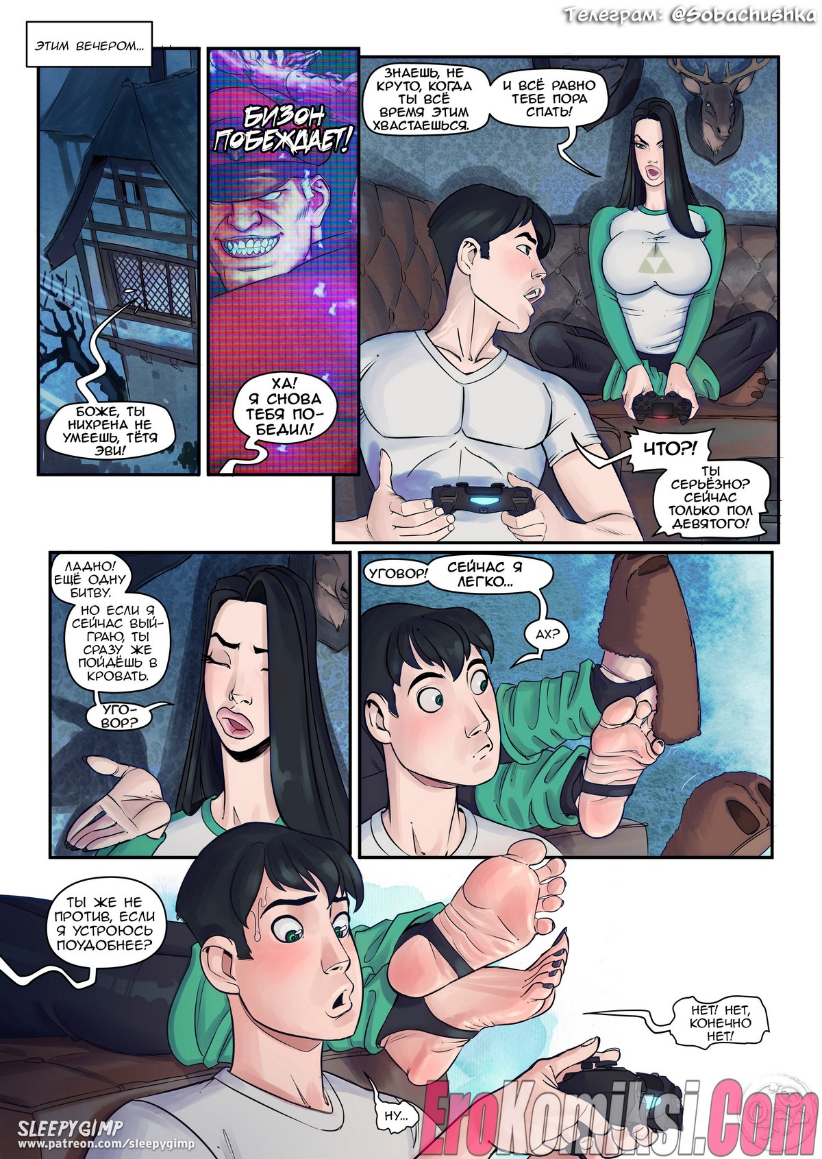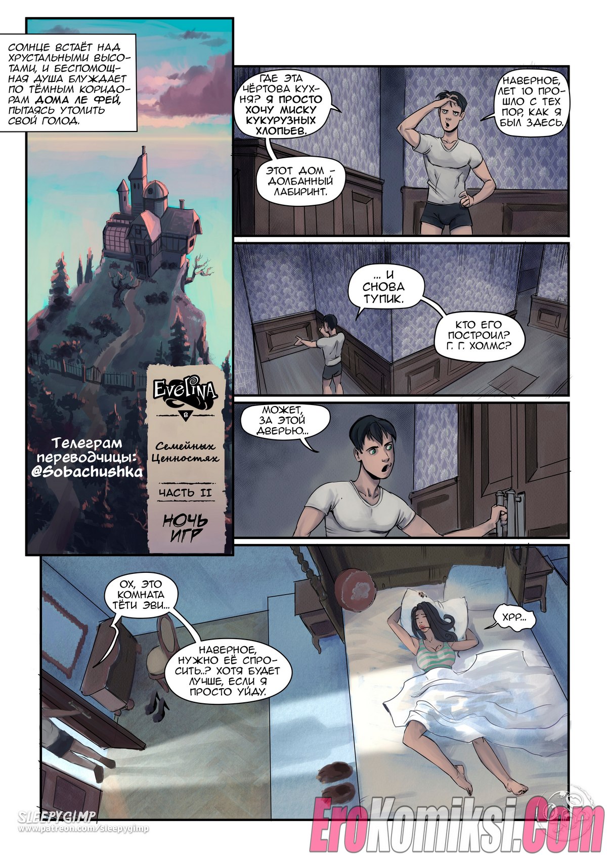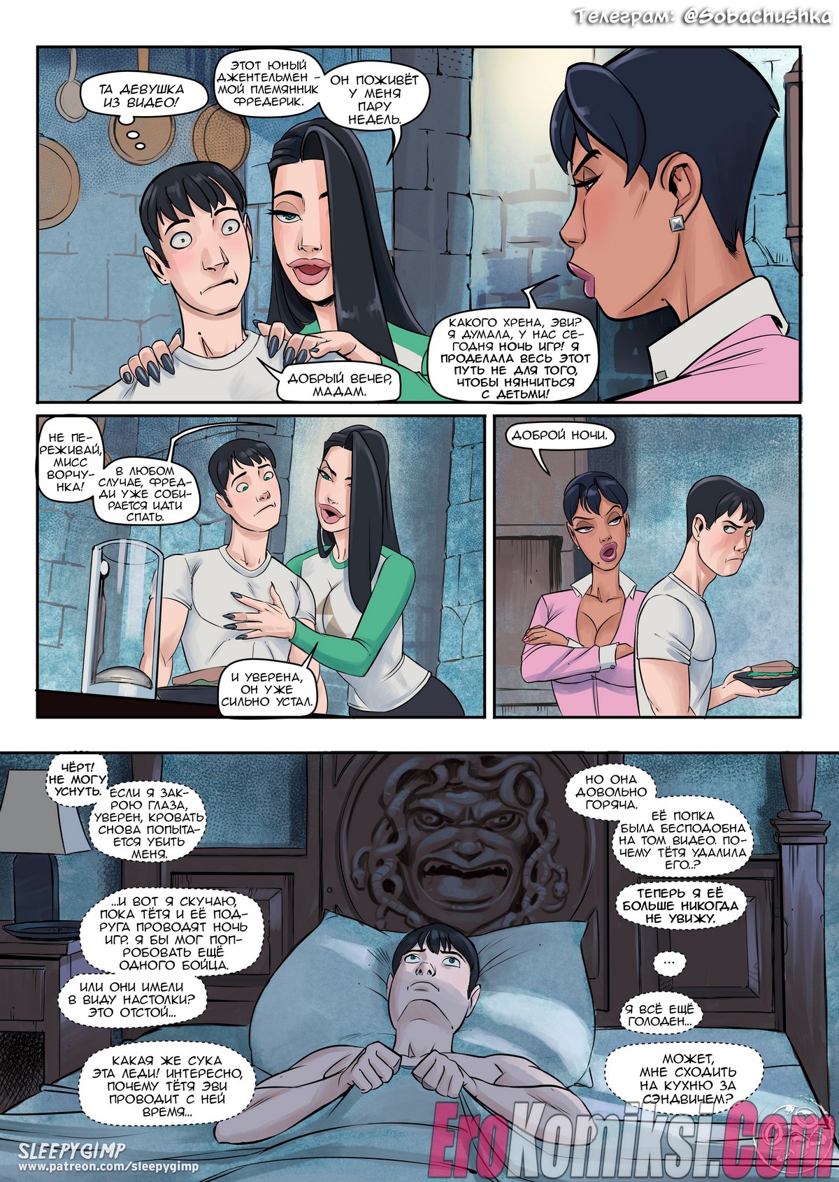 Секс комикс Семейные ценности. Часть 2. Возбужденный юноша проснулся после глубокого сна в доме своей сексуальной тетушки, он случайно увидел, как она спит абсолютно голая, но не стал приставать к знойной женщине. Потом парень шёл порно фотографии с участием его тети и сильно возбудился.
