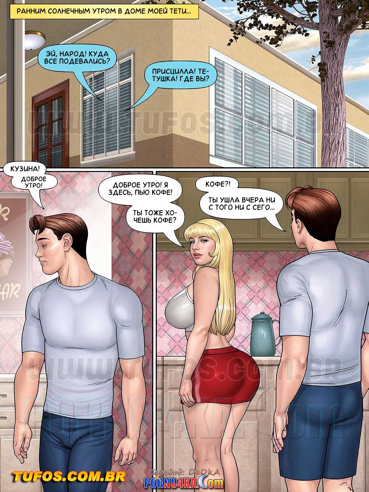 Секс комикс Шаловливая кузина. Часть 3: Задница на кухне. Не подозревая о том, какие отношения сложились у Присциллы и Луиса, Элоиза приглашает Луиса провести ночь в ее доме. Луис по полной воспользовался этим предложением, но оказалось, что ночи не хватило для всего того, что он хотел получить от Присциллы. Но, к его счастью, все сложилось так, что у него появился шанс утром продолжить начатое прямо на кухне…