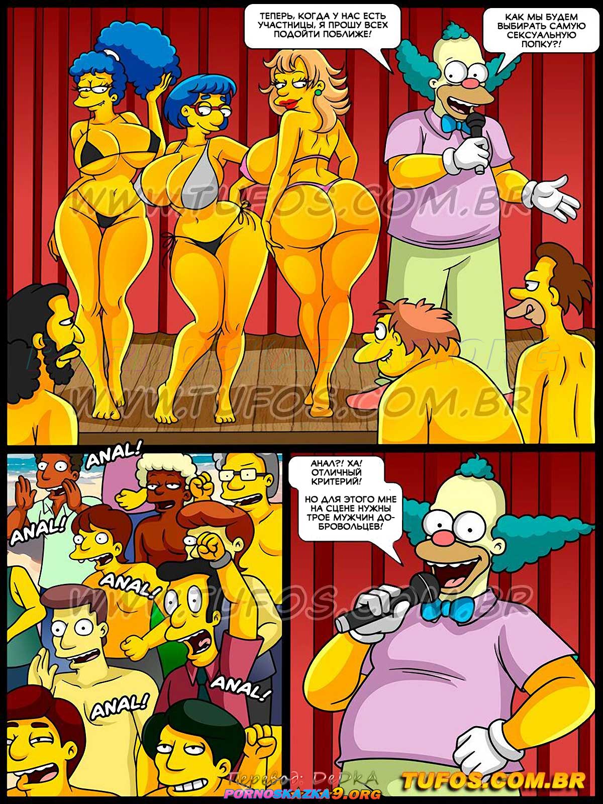 Секс комикс Симпсоны. Часть 67: Самая сексуальная попка на пляже. Клоун Красти устраивает необычный конкурс на пляже Спрингфилда… Клоун хочет выбрать самую сексуальную задницу на пляже! Однако, когда участницы уже вышли на сцену, оказалось, что конкурс не ограничится только внешним видом задниц участниц, ведь толпа жаждет увидеть, чья из задниц участниц будет лучше в анальном сексе…