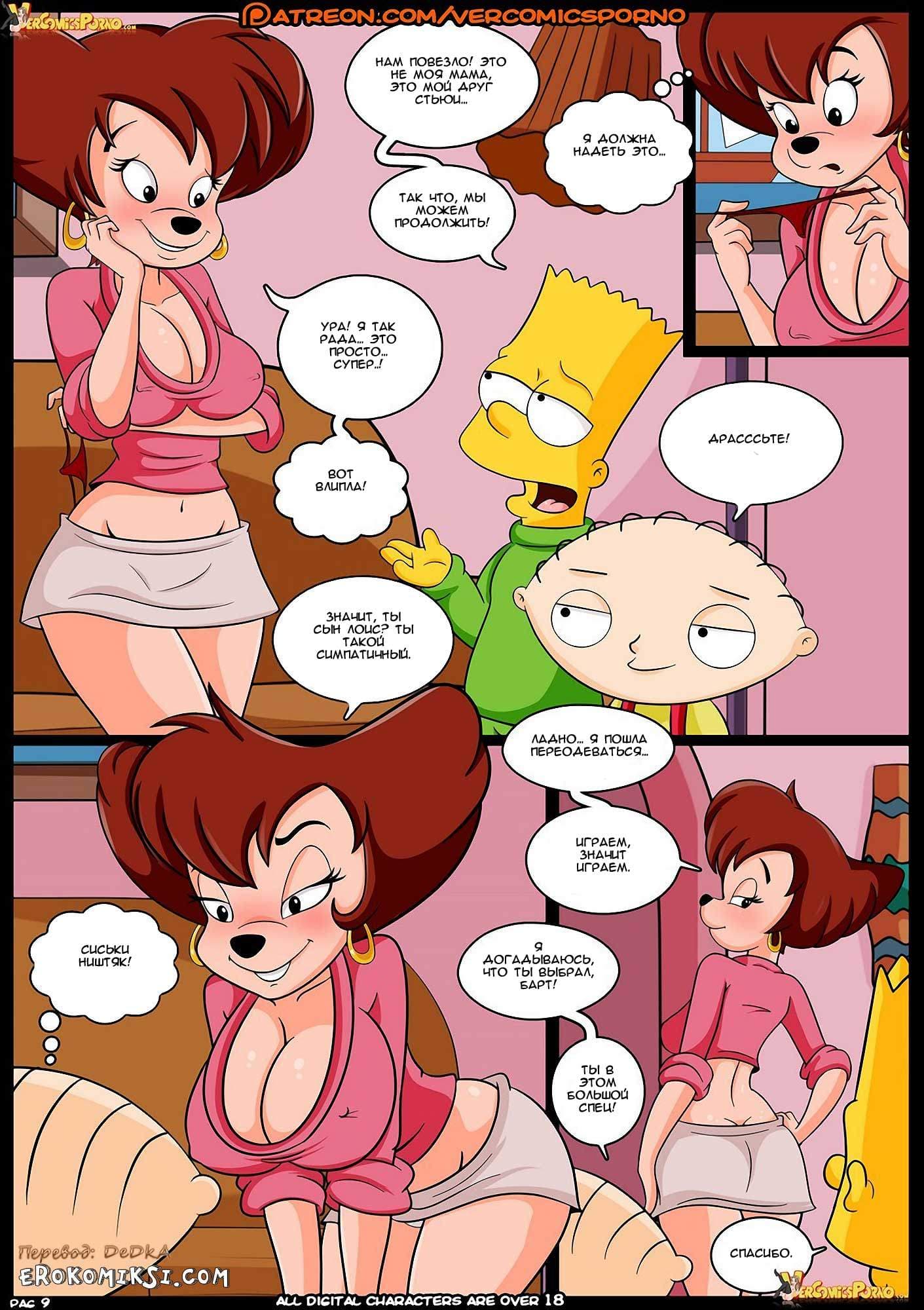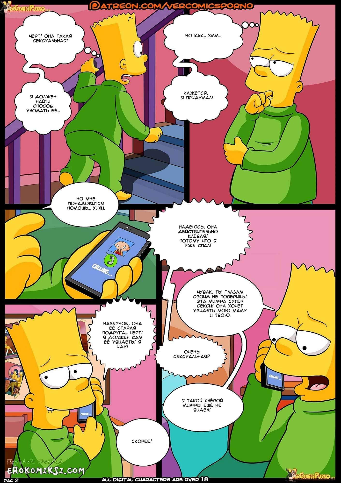 Секс комикс Симпсоны. Конкурс. Часть 3. В то время, пока Барт, мечтательно витал в облаках, представляя аппетитную незнакомку в сексуальном нижнем белье, зрелая Пег всеми силами, пыталась привести озабоченного парня в чувство. В тот момент, когда взрослой даме это удалось, Пег попросила Барта позвонить его мамочке и спросить, когда она вернется. Но, на данный момент, единственное, о чем мог сейчас думать Барт, это о том, как трахнуть горячую подружку своей матери, и чтобы реализовать данное желание, он немедленно позвонил своему другу Стьюи…