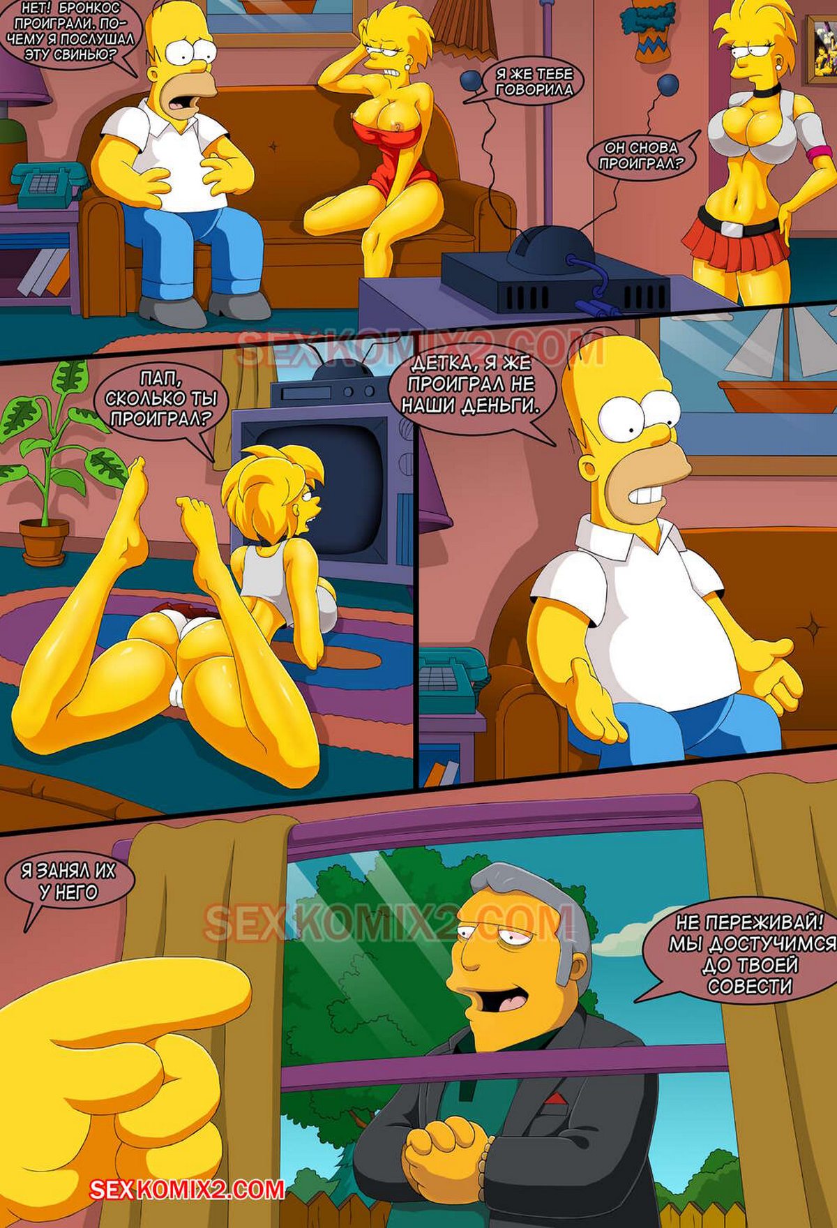 Секс комикс Симпсоны. На планету Оргазмо. Гомер сильно задолжал боссу мафии, чтобы искупить свой долг он соглашается уговорить своих дочерей сняться в порно фильме. Девушки не сразу поддержали его просьбу, но всё же согласились так как давно хотели занять лесбийским сексом…