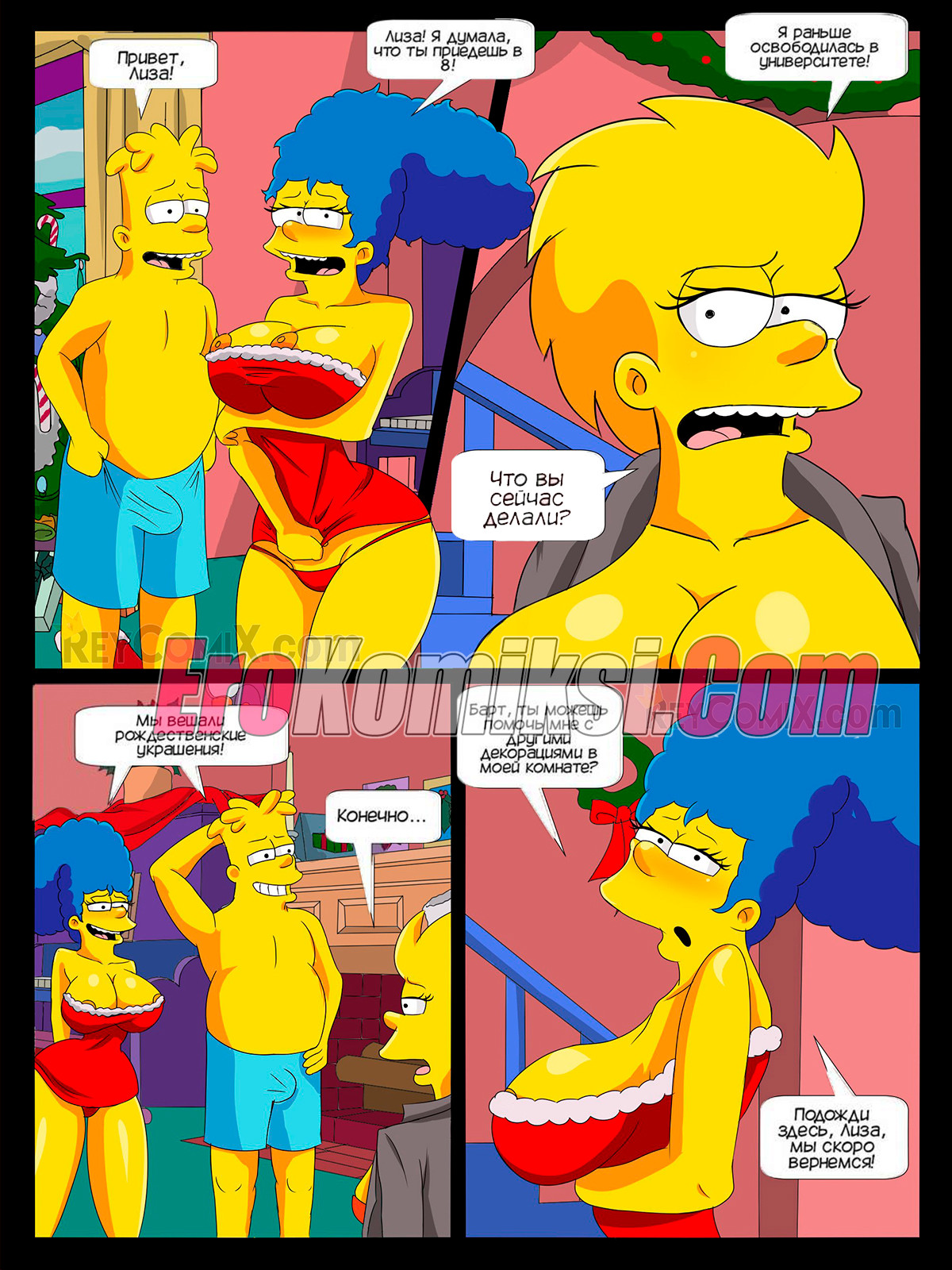Секс комикс Симпсоны. Семейное Рождество. Family Christmas. Pokuarts Лиза приехала на рождество домой и спалила свою зрелую сочную мамку и Барта за сексом. Сучка разозлилась, что они не позвали ее к себе и присоединилась к ним. Барт трахнул двух красоток, а затем обкончал их титьки.