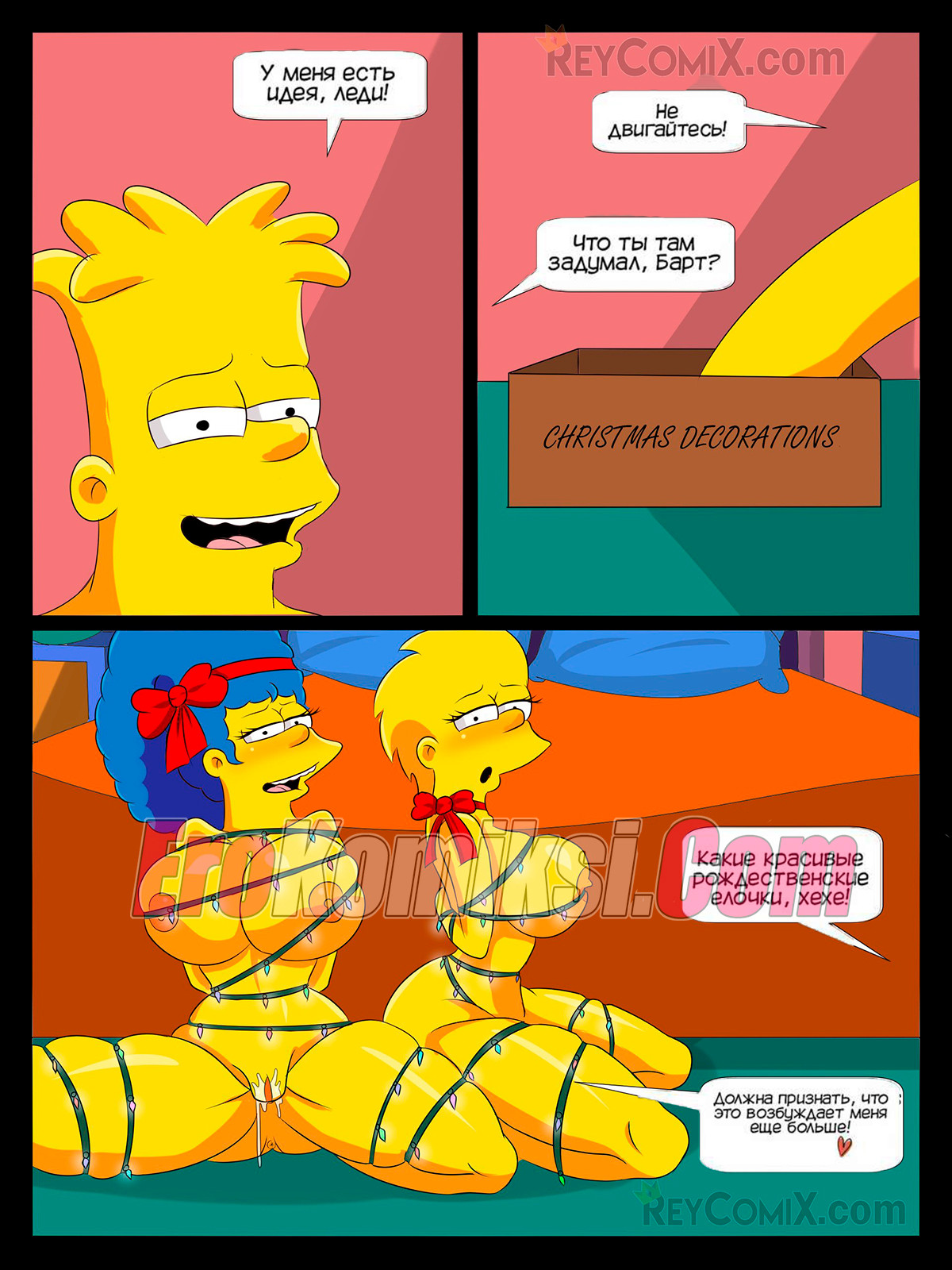 Секс комикс Симпсоны. Семейное Рождество. Family Christmas. Pokuarts Лиза приехала на рождество домой и спалила свою зрелую сочную мамку и Барта за сексом. Сучка разозлилась, что они не позвали ее к себе и присоединилась к ним. Барт трахнул двух красоток, а затем обкончал их титьки.