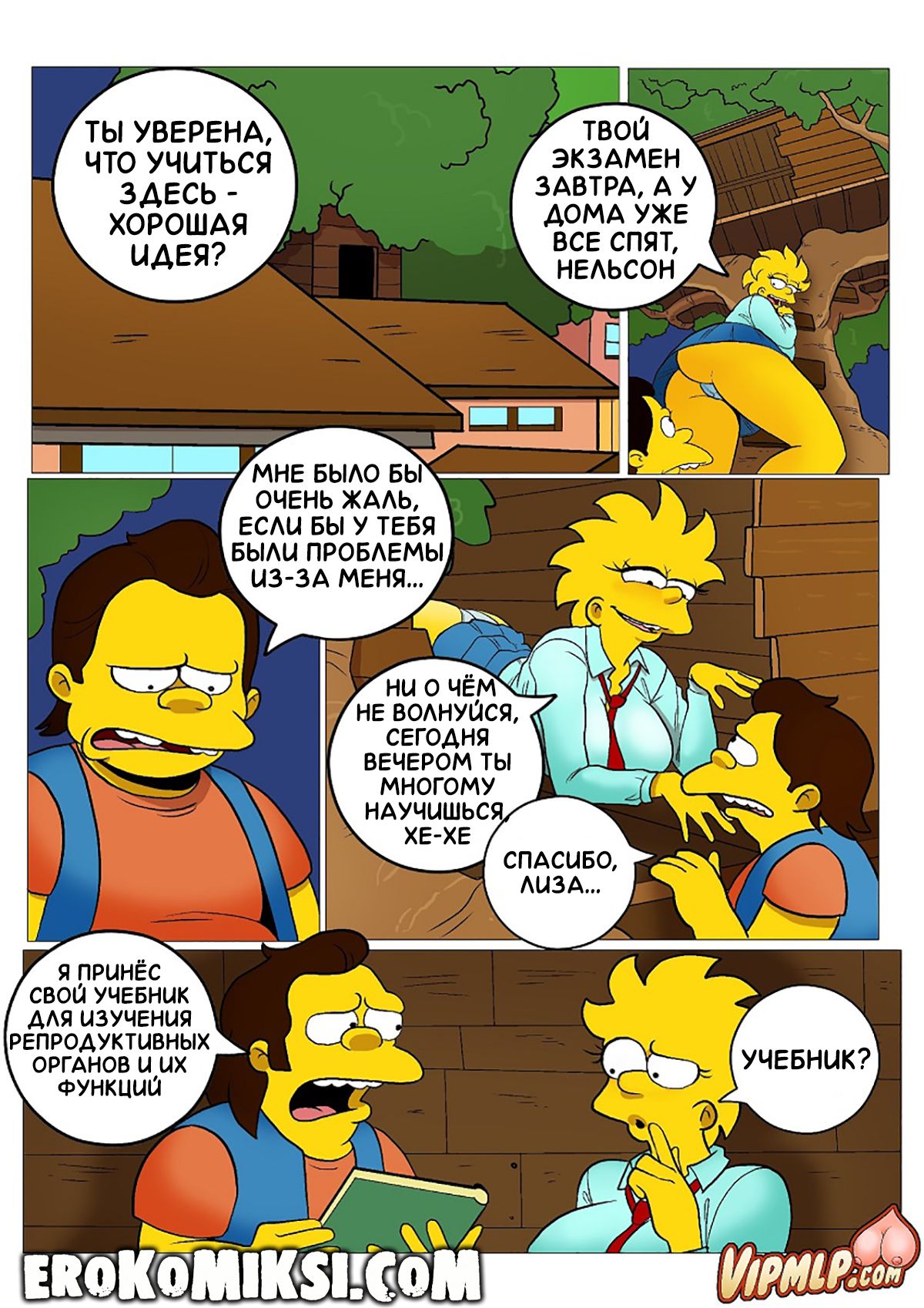 Секс комикс Симпсоны. Урок анатомии. Нельсон просит Лизу о помощи в подготовке к экзамену по анатомии и естественно, Лиза не может ему отказать. Они отправляются в домик на дереве, чтобы никому не мешать и им никто не мешал. Нельсон притащил свой учебник, но у Лизы свои методы обучения, она предпочитает демонстрировать все самые важные женские части тела, чтобы лучше запоминалось…
