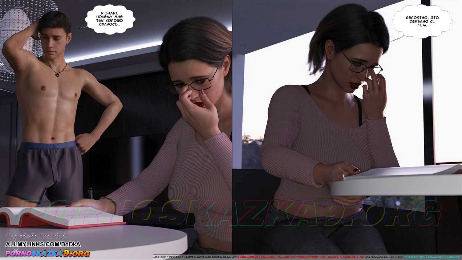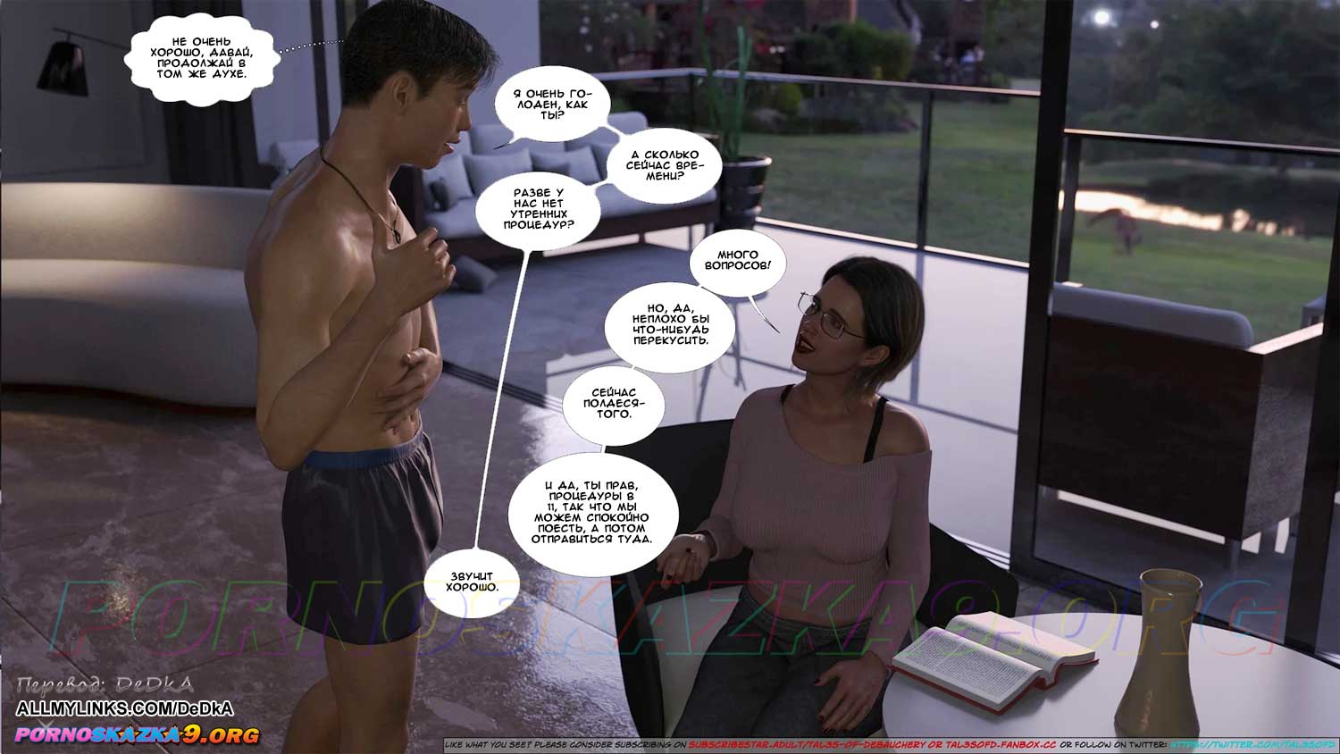 Секс комикс Слабость матери. Часть 9. В 11 утра Дилан и Изабелла отправились на заранее заказанный массаж, но оказалось, что из-за невнимательности массажиста при приеме заказов, он оформил 2 сеанса массажа на одно и то же время, поэтому массажист предложил Дилану самому сделать массаж своей спутнице. Дилан с удовольствием согласился, и массажист отправился к другой клиентке, оставив Дилана и Изабеллу наедине в массажном кабинете…