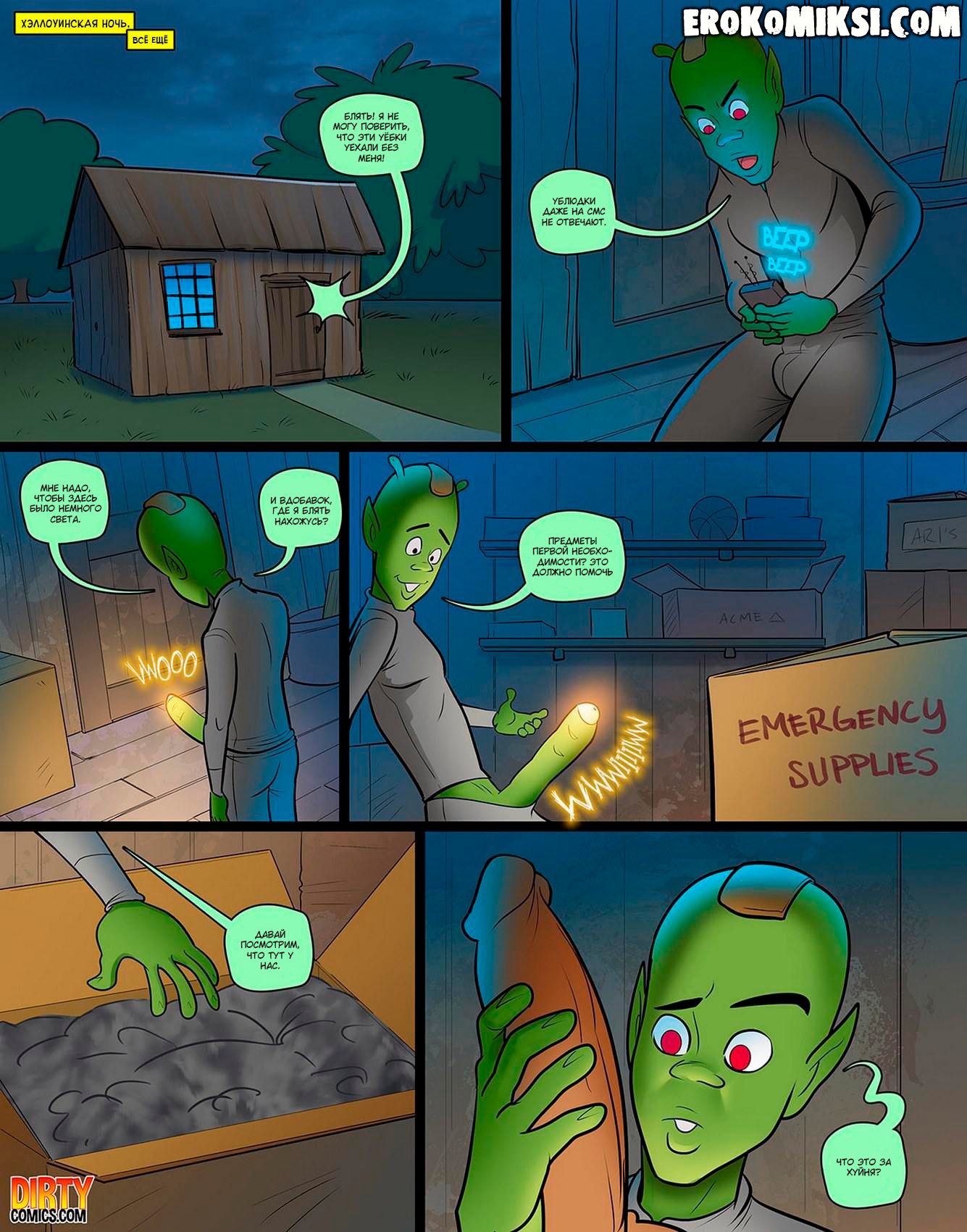 Секс комикс Спасение Хэллоуина. Часть 2. Инопланетянин попадает на землю в сарай с заначкой очень сексапильной девчонки, но даже не догадывался, что его будет ждать в недалеком будущем…