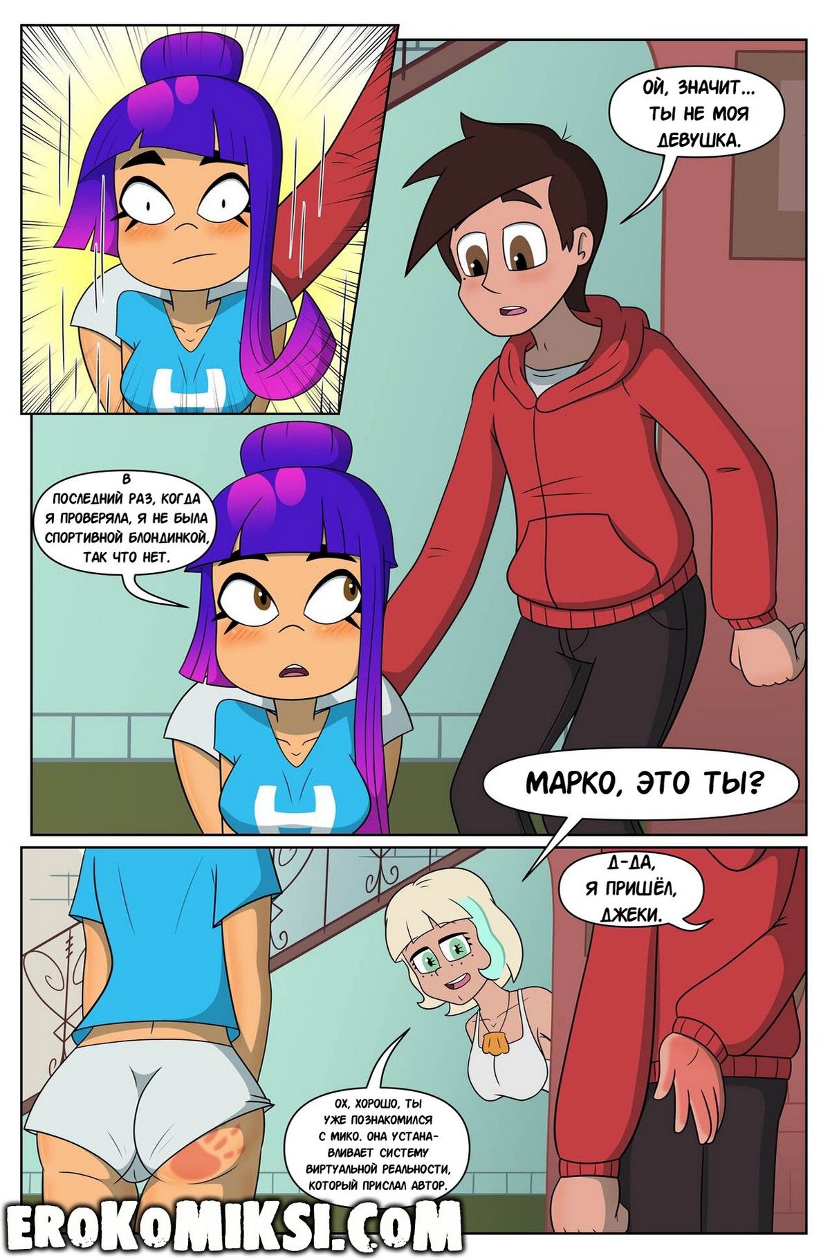 Секс комикс Стар против сил зла. Виртуальная реальность. Марко вернулся домой и случайно ударил по огромной заднице в очень коротких шортах не свою девушку. Замяв эту конфуз, Марко, Джеки и Мико решили войти в систему виртуальной реальности и настроить свои аватары…