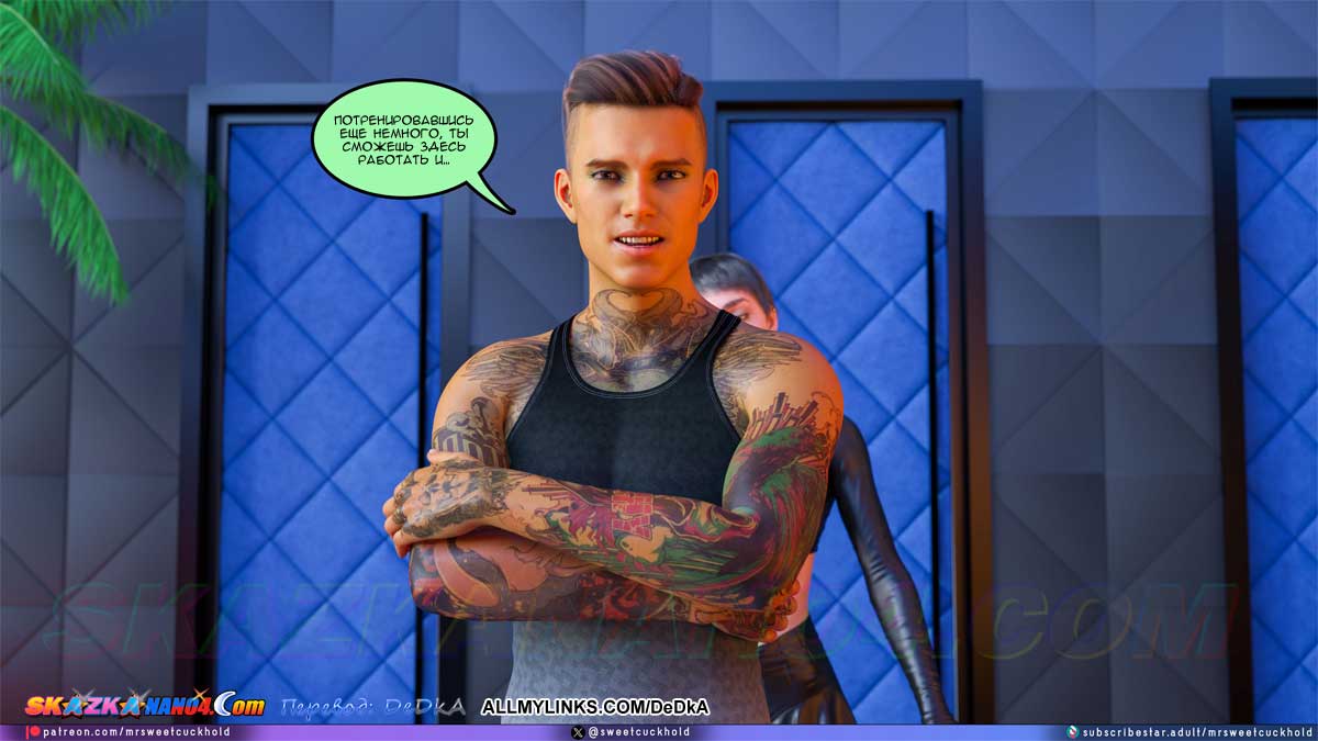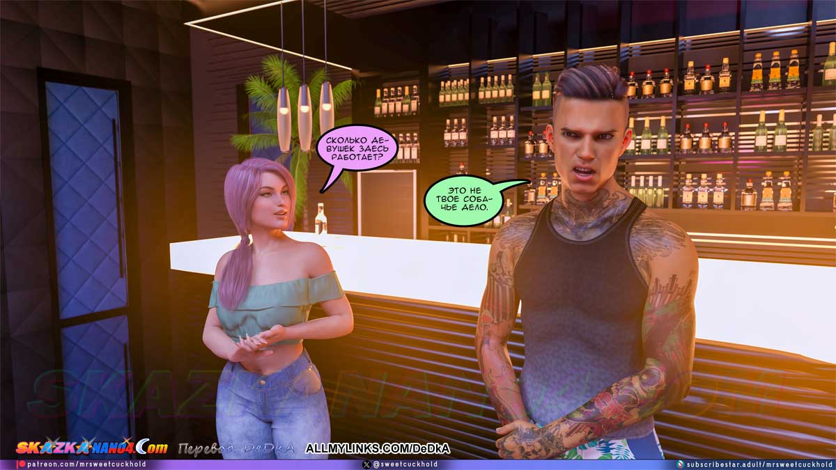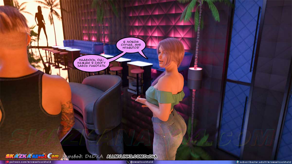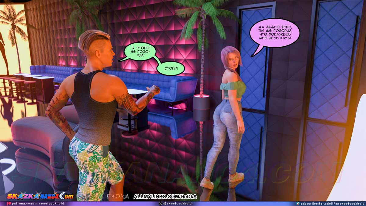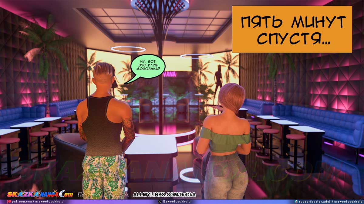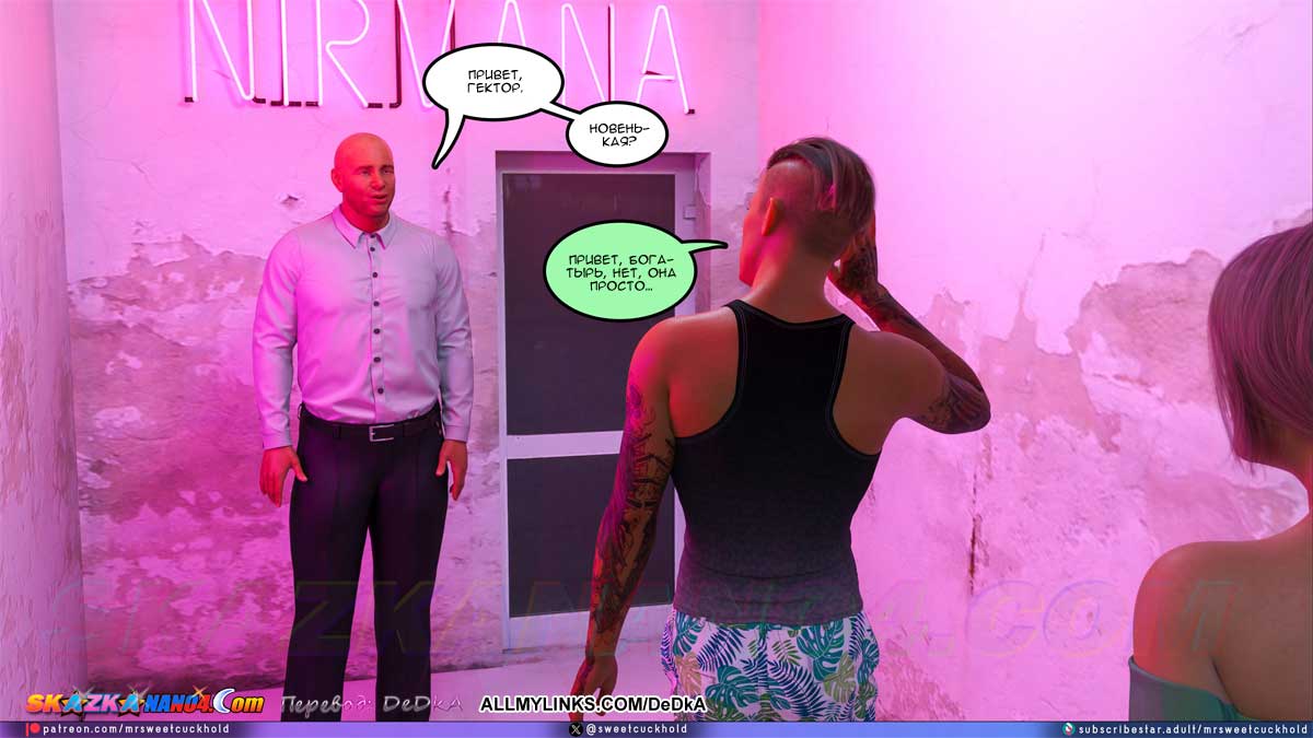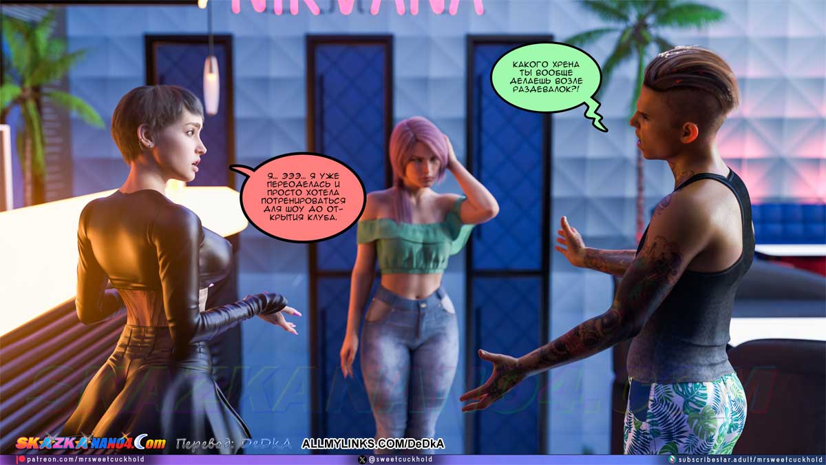 Секс комикс Тайная измена. Часть 11. Наконец Гектор привел Эшли в клуб «Нирвана», но пока еще не на работу, а на краткую экскурсию. В это время клуб еще не работал и был пуст. Эшли поняла, что ничего полезного она сейчас не узнает. Но вдруг появилась одна девушка, которая работает в клубе и Гектор, пошептавшись с ней, представил ее Эшли. Майя, так звали девушку, тут же предложила Эшли как-нибудь встретиться, выпить и поболтать. Эшли обрадовалась, решив, что от Майи она узнает подробности того, что твориться в клубе. Но Эшли не знала, что Гектор уже поручил Майе кое-какое задание по поводу Эшли…
