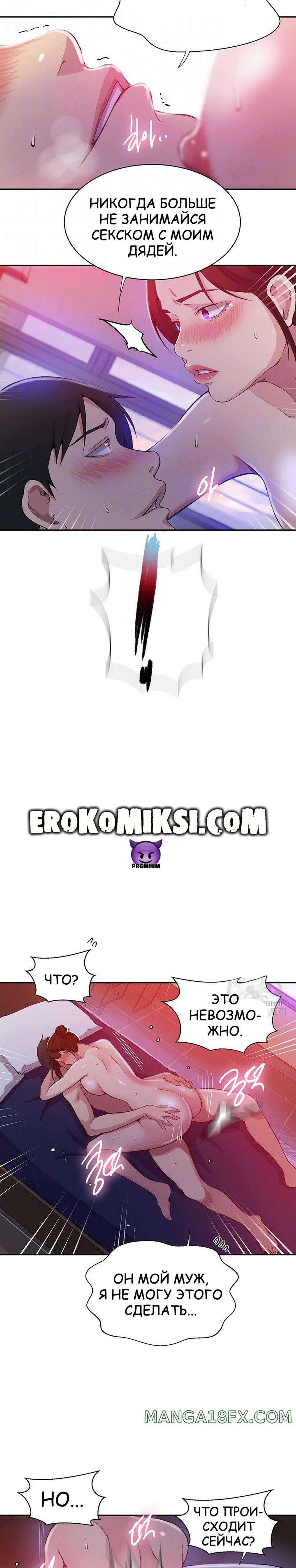 Секс комикс Тайное обучение. Часть 197. Даехо хочет узнать правду, но для этого он должен до конца убедиться, что его тётя в его власти. Он заставляет её отказаться от постели с мужем и кончаем прямо в её горячую киску…