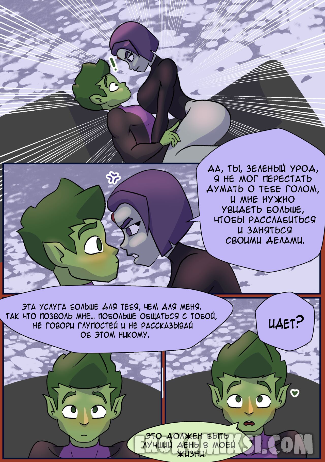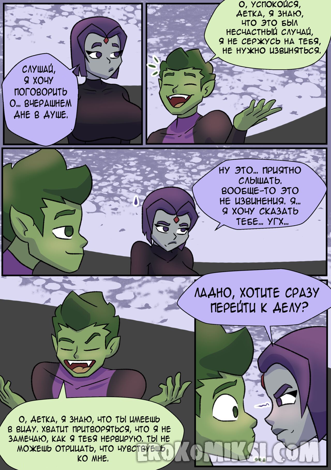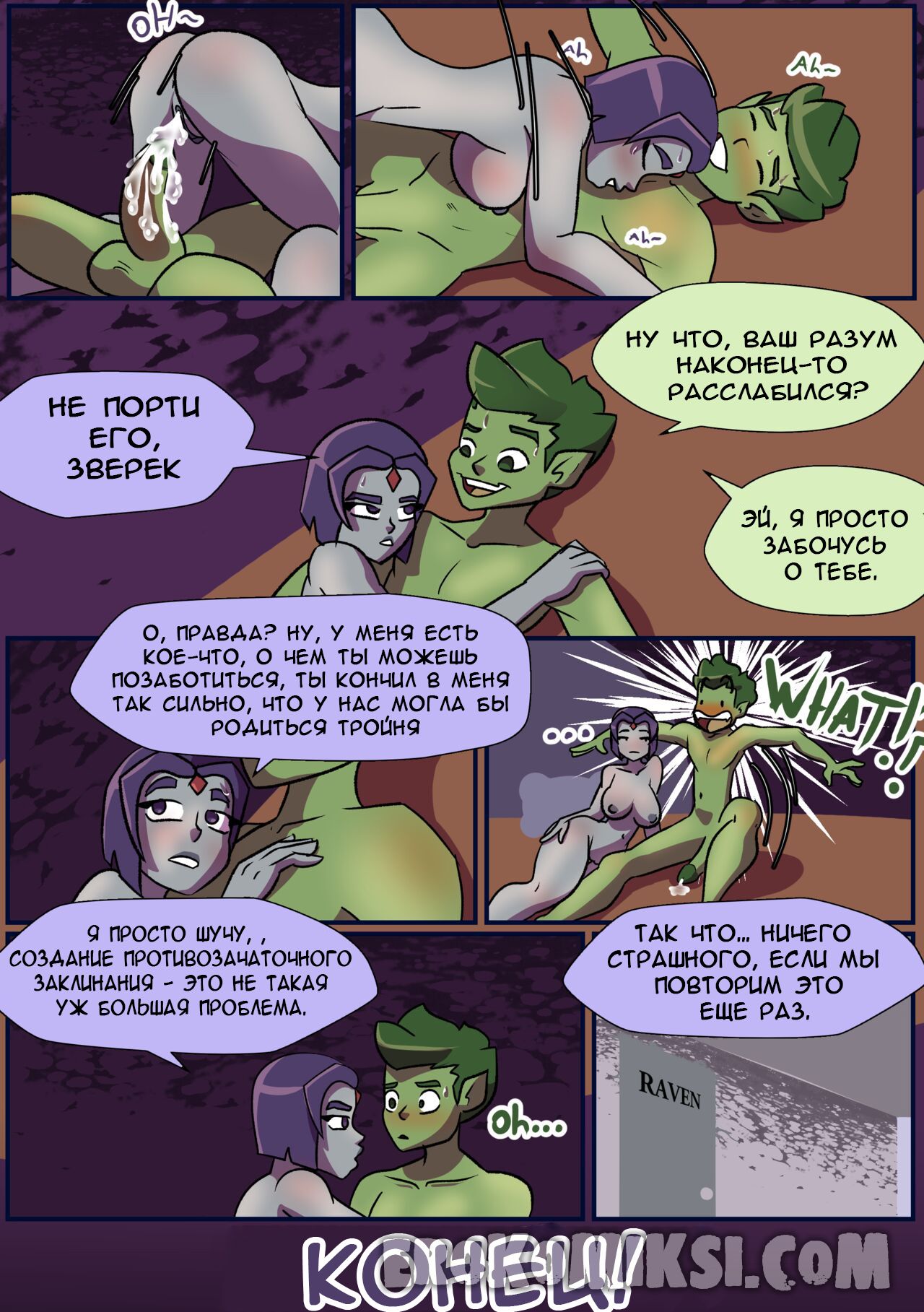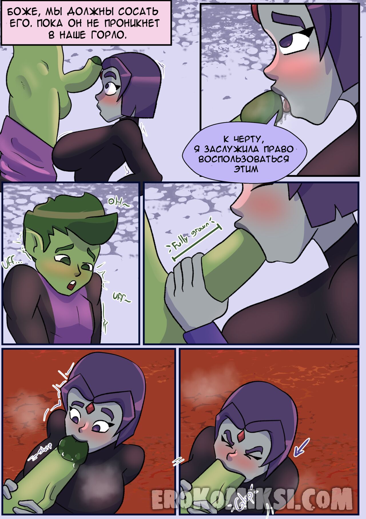 Секс комикс Титаны. Бурные чувства. Не спокойная Рейвен постоянно мечтает о сексе с Бист Боем, от чего не может сосредоточится. Однако вскоре ей выдался прекрасный момент где она смогла оторваться с ним на всю катушку, трахаясь весь день…