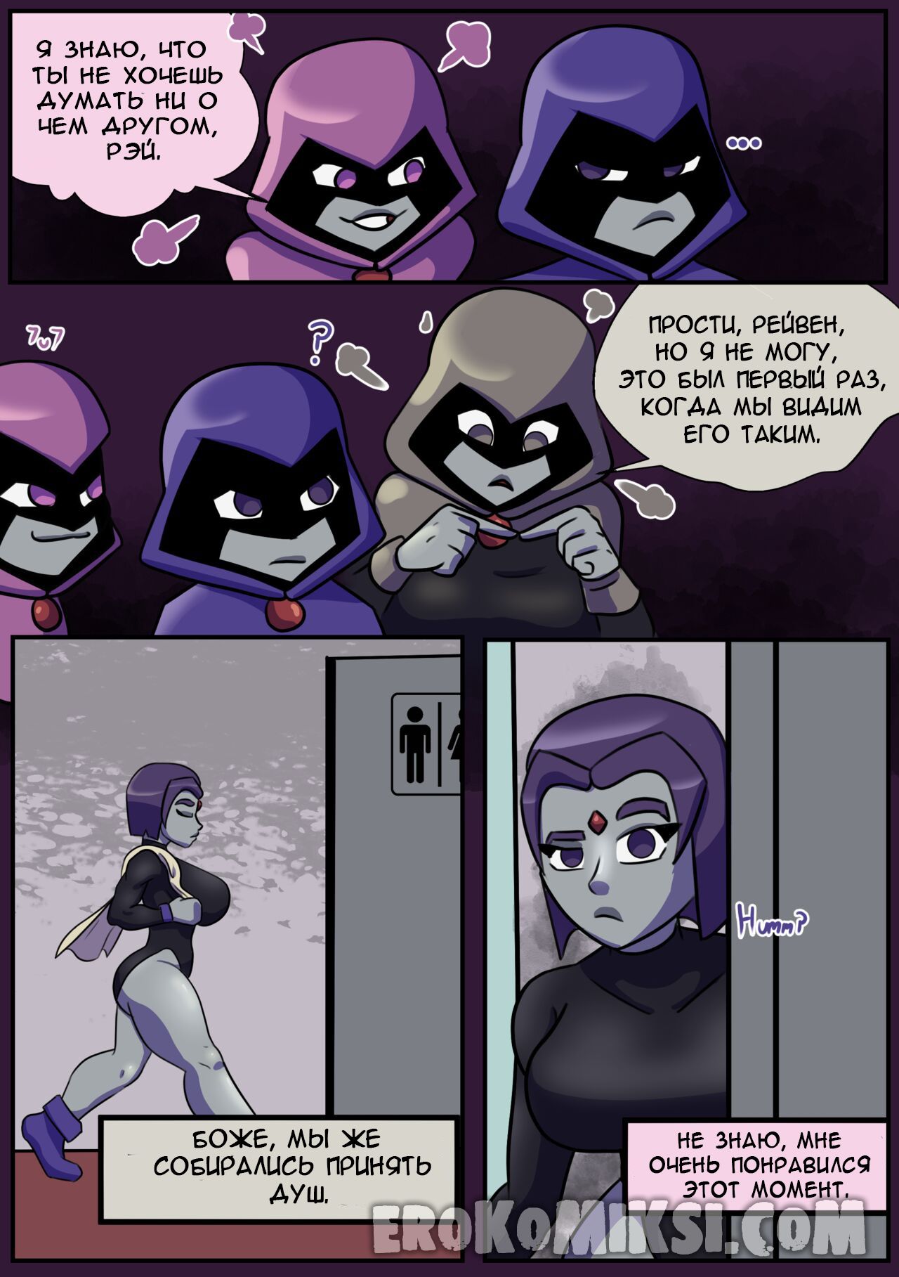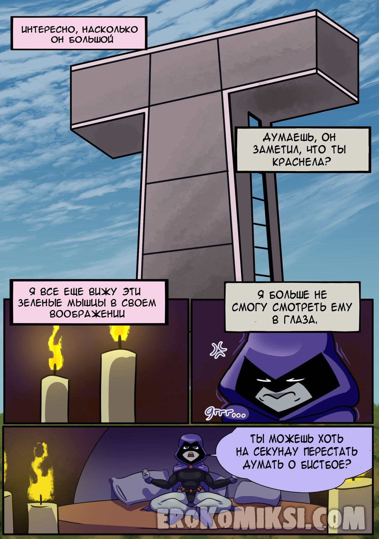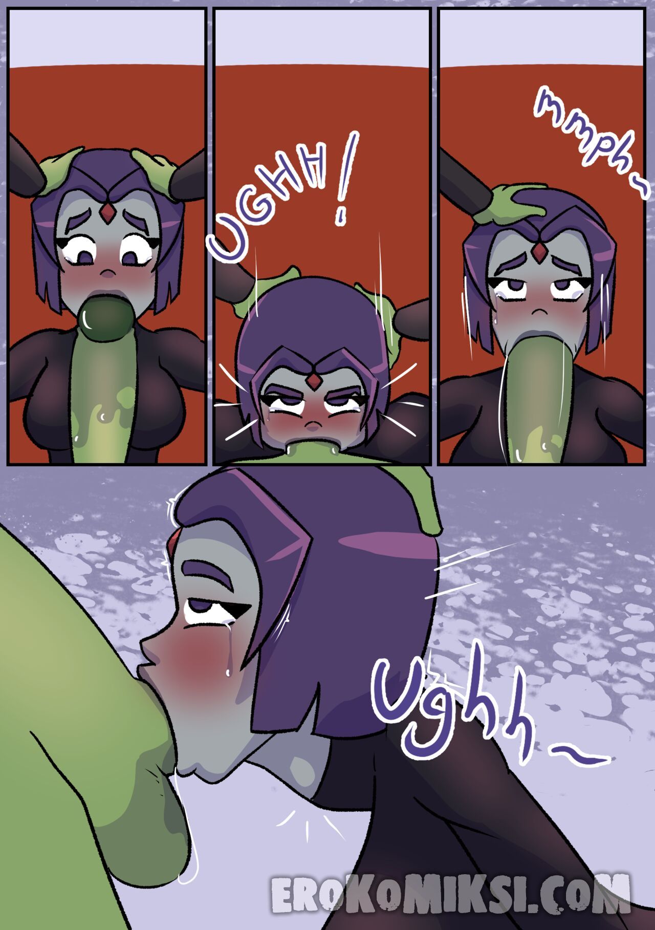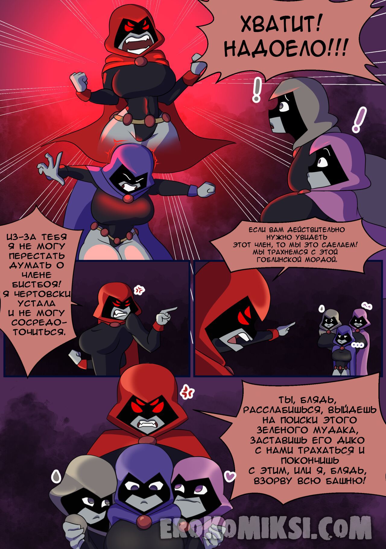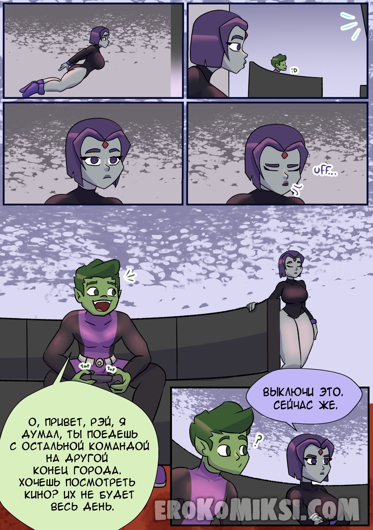 Секс комикс Титаны. Бурные чувства. Не спокойная Рейвен постоянно мечтает о сексе с Бист Боем, от чего не может сосредоточится. Однако вскоре ей выдался прекрасный момент где она смогла оторваться с ним на всю катушку, трахаясь весь день…