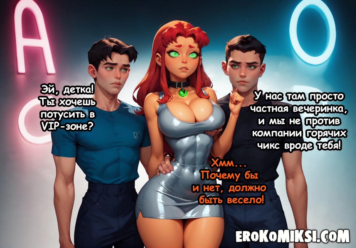 Секс комикс Титаны. Старфайер в клубе. Жажда нового опыта приводит Старфайер в шумный земной клуб. Решив отбросить условности, она сознательно погружается в пучину земных удовольствий. И в итоге она знакомится с компанией молодых ребят со своей частной вечеринкой…