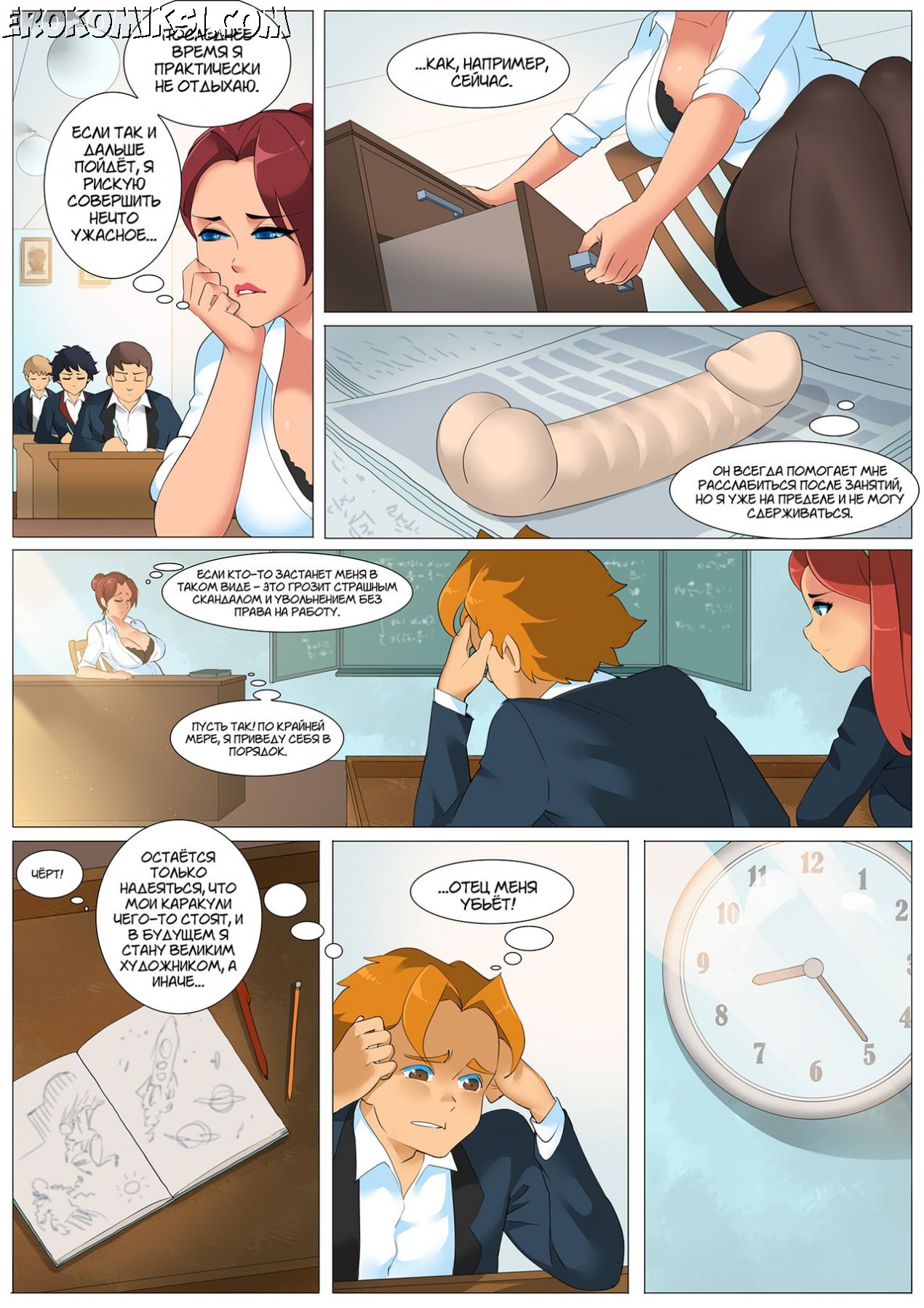 Секс комикс Тяга к учебе. Бывает учительница может понравится, но когда твоя преподавательница — это шикарная милфа с большими сиськами и упругой попкой, а о том, как бы ее трахнуть, а вечный стояк не дает встать из — за парты…