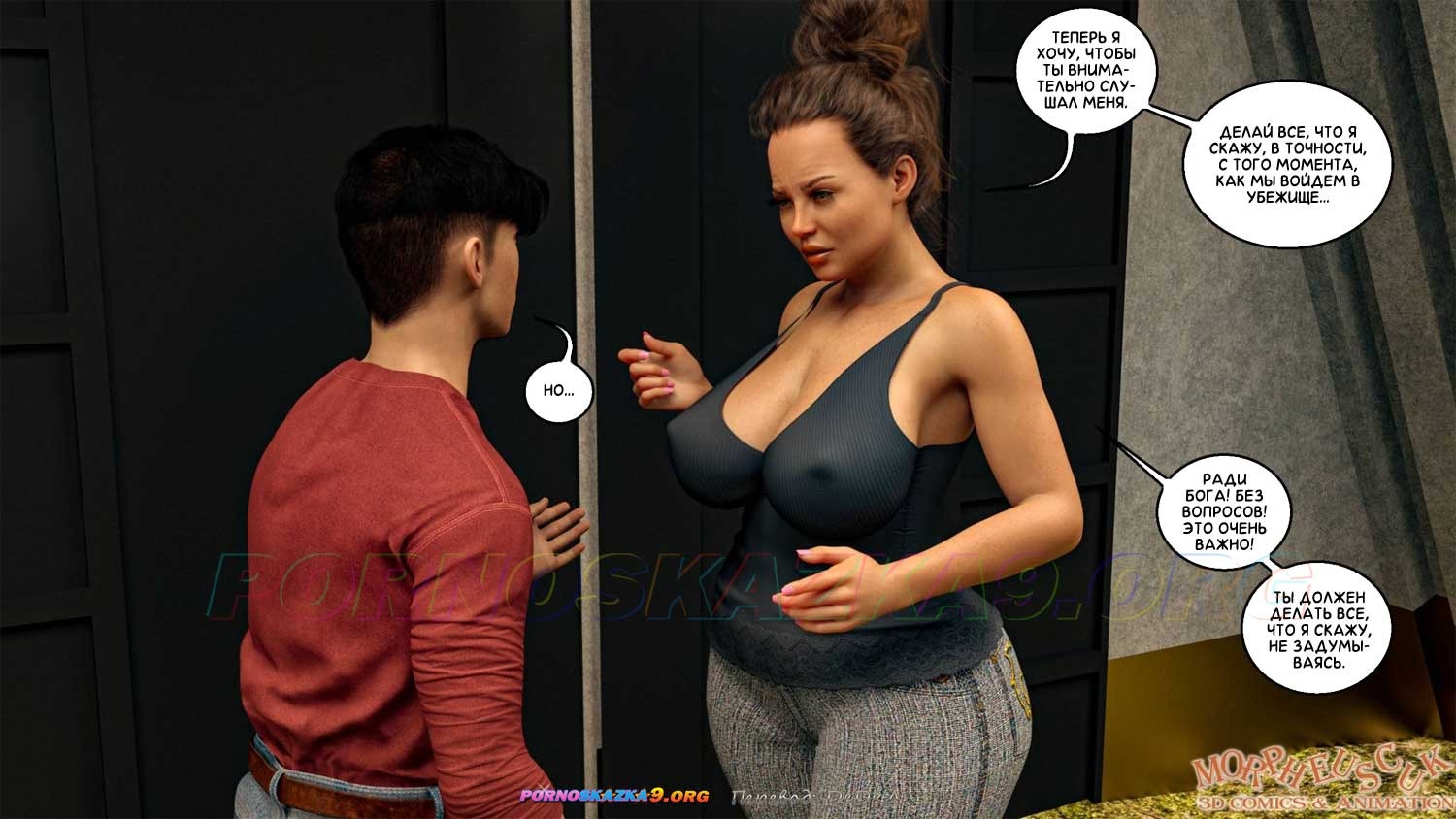 Секс комикс Укрытие. Часть 1. Боб и Грейс после неудачного эксперимента вынуждены спрятаться в убежище, которое было предназначено для защиты от опасного вируса. Теперь, какое-то время зрелая большегрудая женщина и парень должны прожить в нем. Что же ждет наших героев…