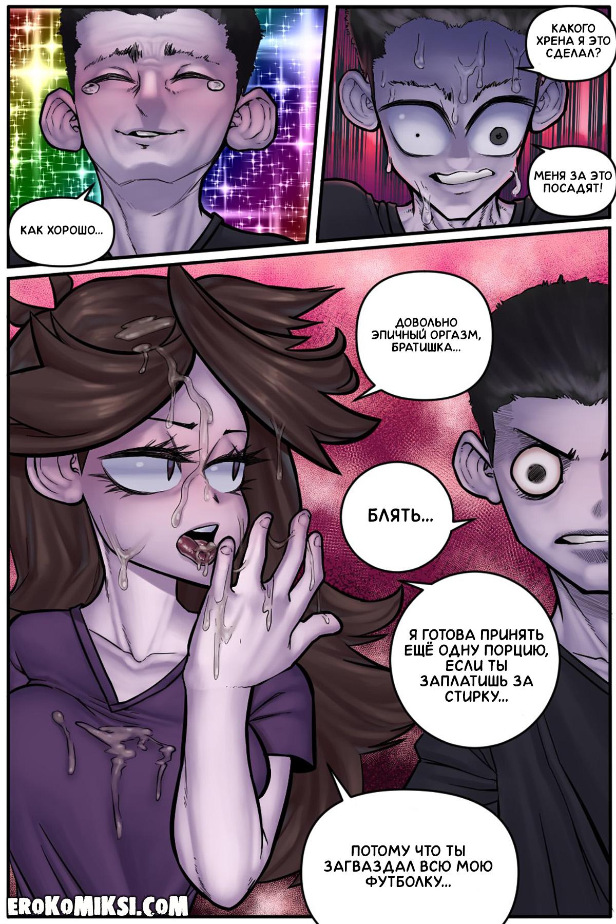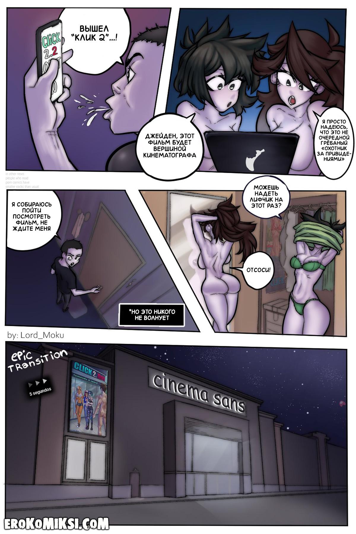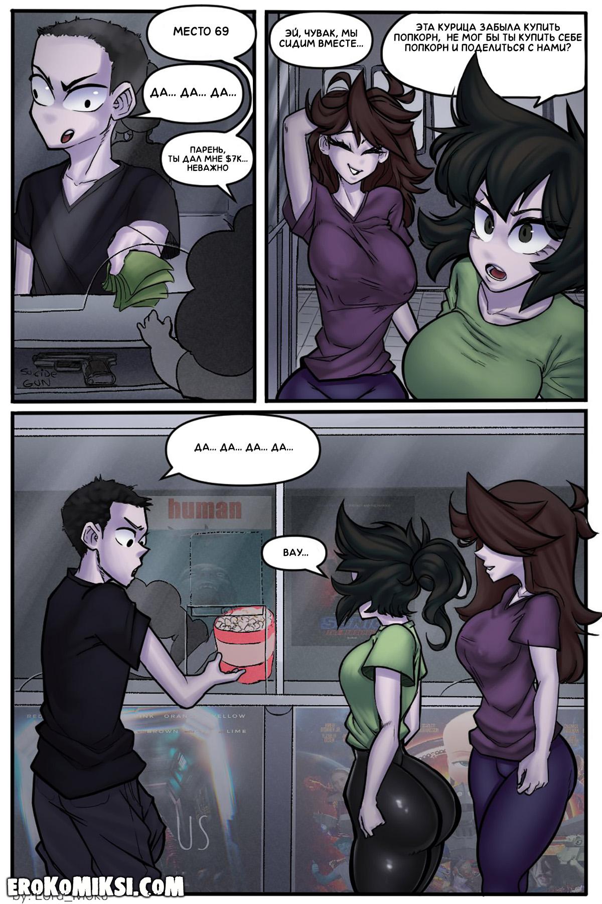 Секс комикс Уловка с попкорном. Парнишка сидел в кинотеатре между двух сексуальных девчонок, и решил рискнуть, засунув свой член в пачку с попкорном и предложил девчонкам угоститься. Девчонки сразу же нащупали его огромный член и на удивление паренька, принялись его сосать.