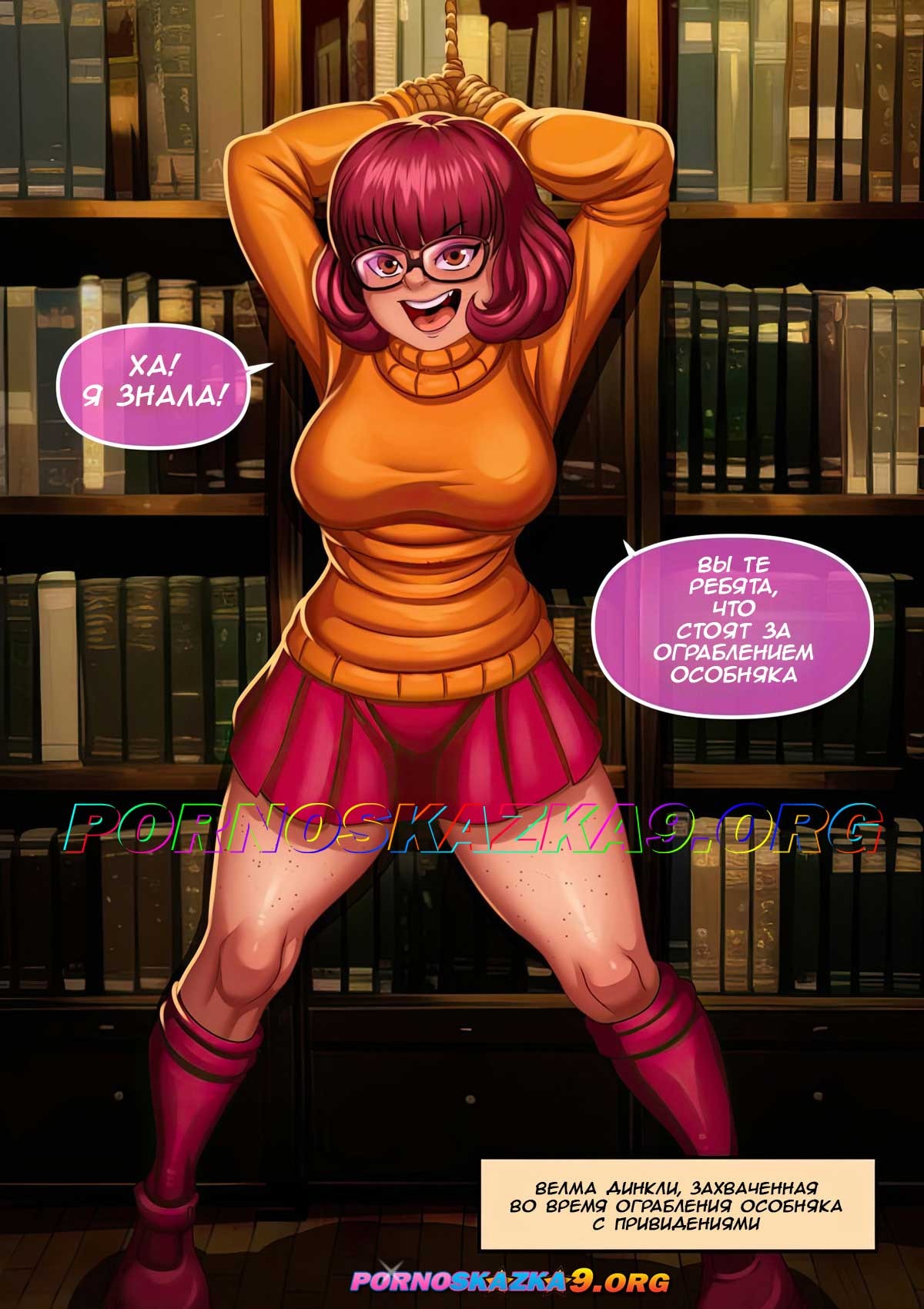 Секс комикс Велма и настоящие злодеи. В этот раз Велма оказалась в незавидной ситуации. Молодому сыщику попались матёрые преступники, которые не сдались, а просто похитили девушку и отправились в другое место, не дожидаясь полицию в особняке, который обокрали. Парни приняли единогласное решение — выебать Велму за то, что она помешала их плану…