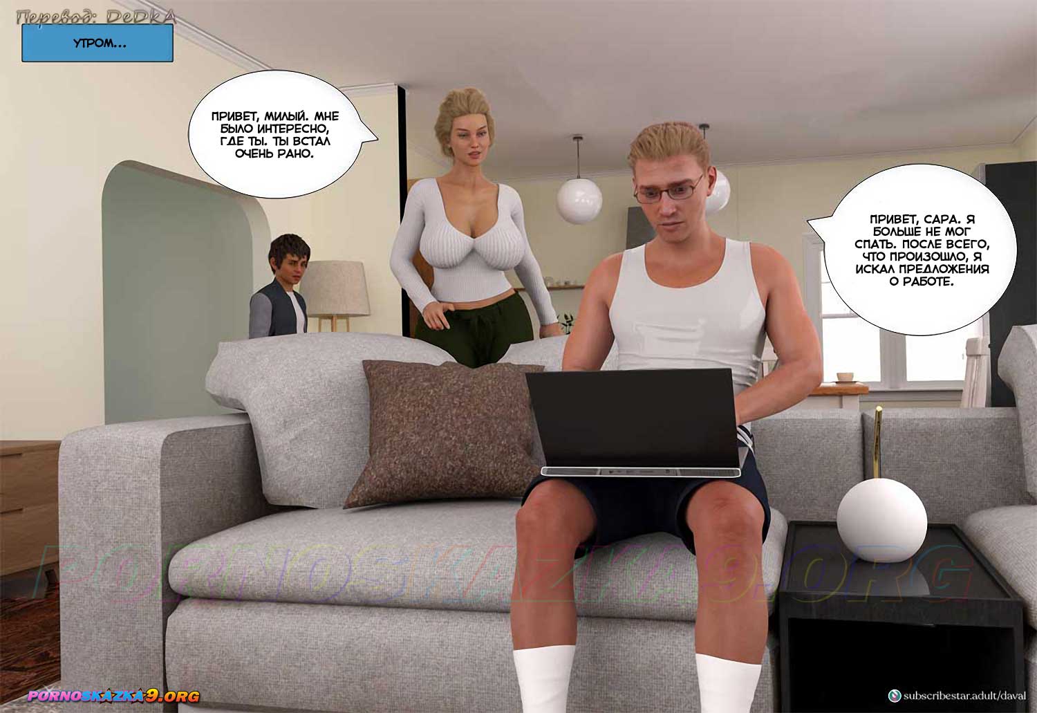 Секс комикс VIP-безумие. Вместе. Часть 7. Дэвид продолжал трахать Сару так яростно, что от тряски кровати проснулся спящий в этой же кровати Люк. К счастью, он не удосужился оглянуться, иначе бы он увидел, что кровать трясется от того, что на ней трахают его жену… Любовники застыли, тряска прекратилась и Люк снова мирно уснул…