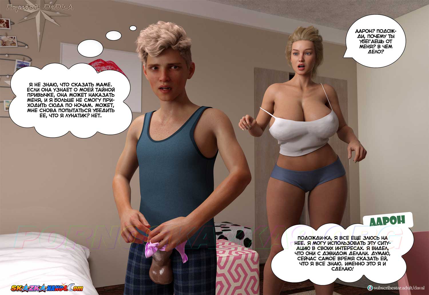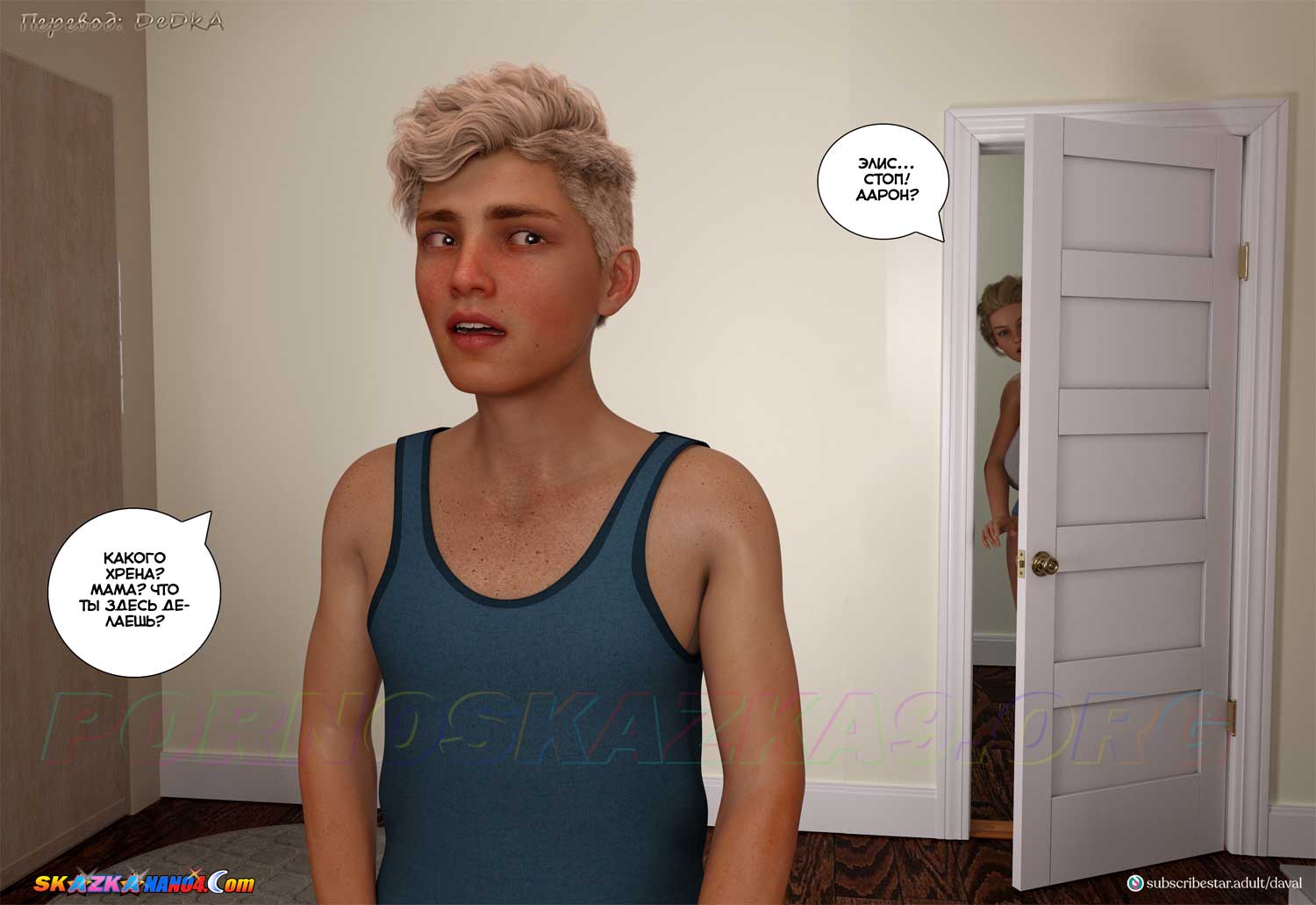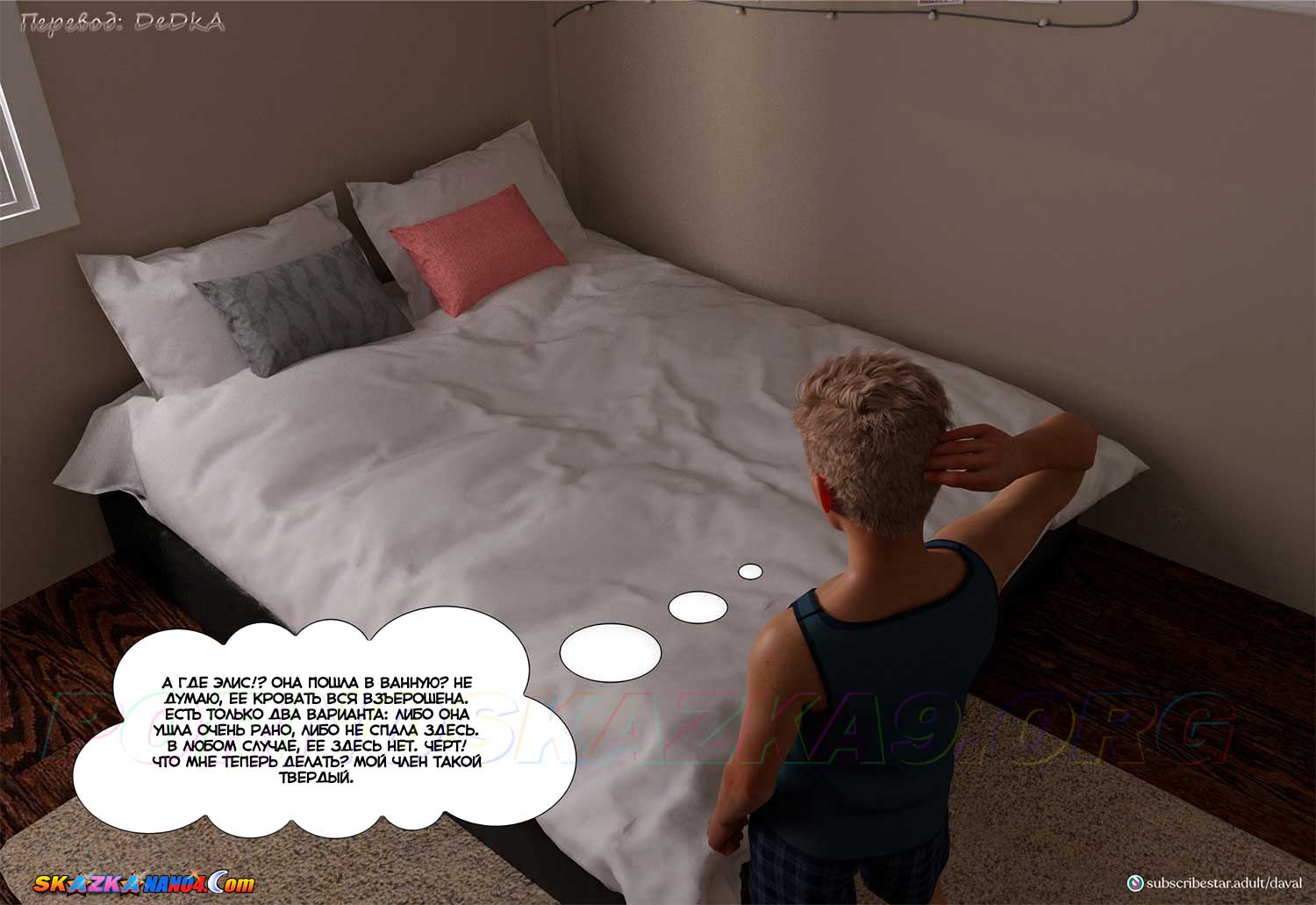Секс комикс VIP-безумие. Вместе. Часть 8. Рано утром Аарон решил заглянуть в спальню Элис, чтобы полапать ее, пока она спит, но Элис в спальне не оказалось. Тем временем Сара, которая тоже проснулась рано, решила заглянуть к Элис, чтобы попытаться объяснить ей то, что произошло вчера, но войдя в спальню Элис, Сара обнаружила там Аарона…