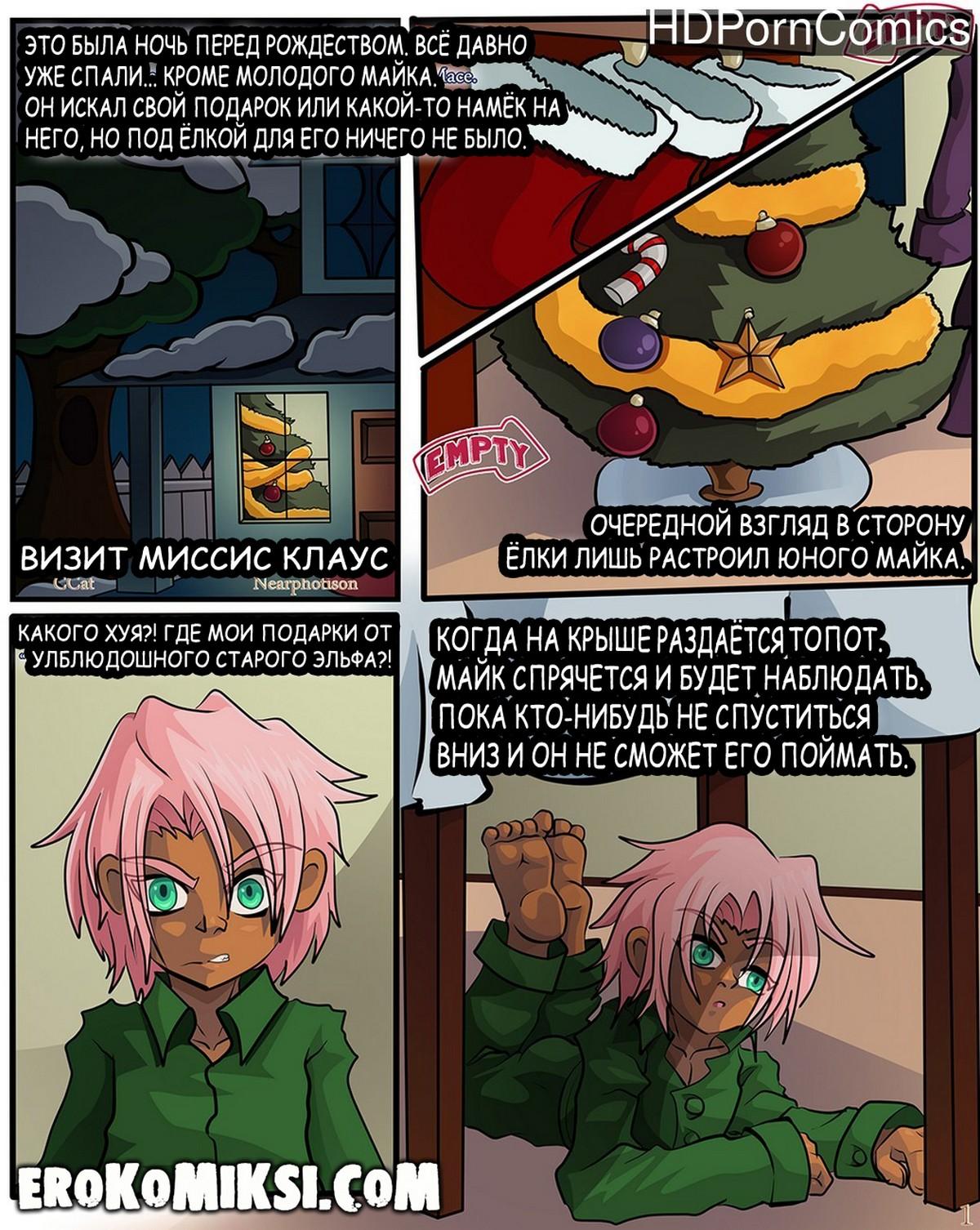Секс комикс Визит миссис Клаус. Горячая милфа Миссис Клаус рылась в мешке для подарков, когда неожиданно на неё набросился Майк, который как дикое животное начала ласкать её тело, а после она уже не смогла сопротивляться его огромному члену…