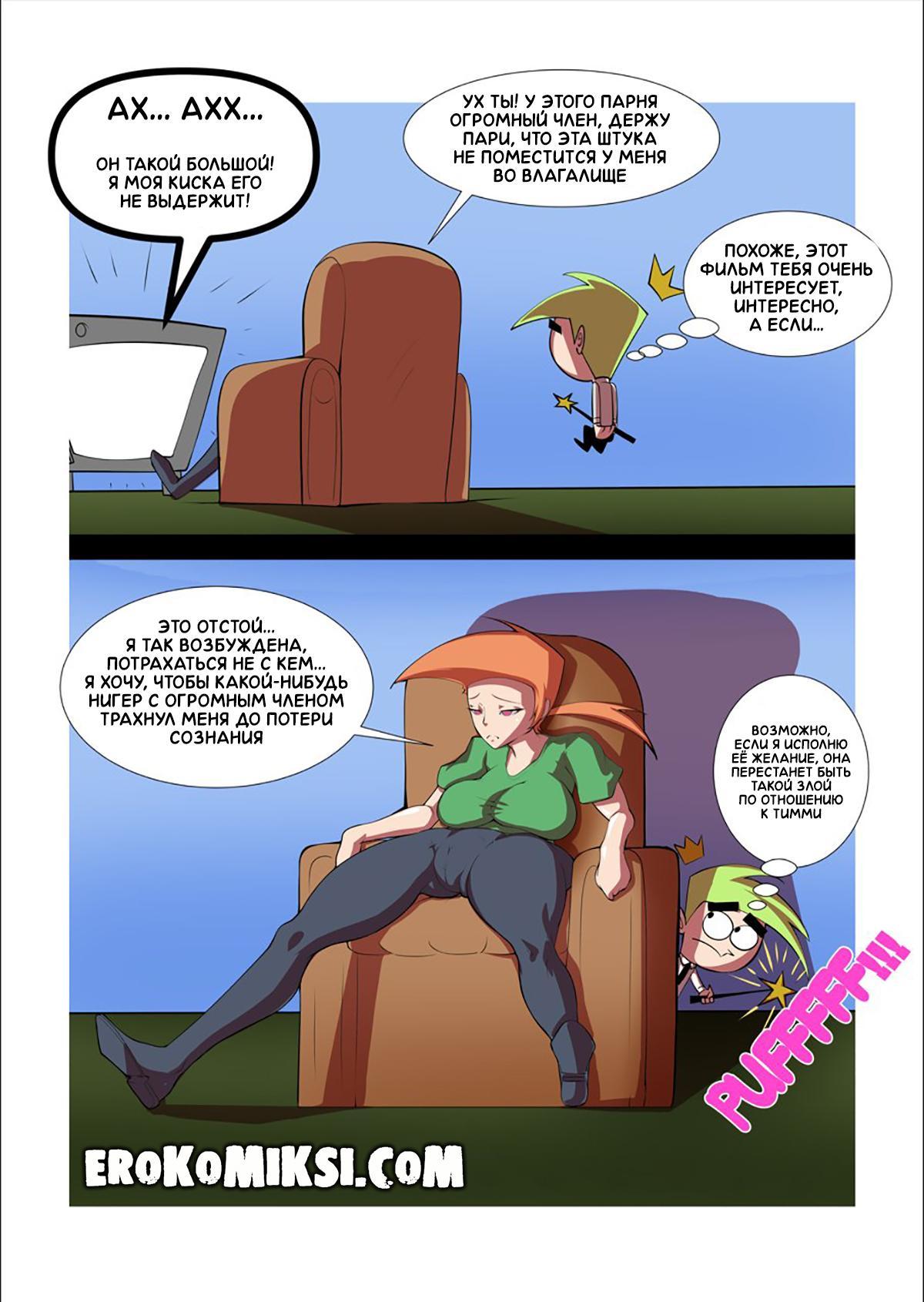Секс комикс Волшебные Родители. Опасное желание Викки. Викки смотрела порно и мечтала, чтобы рядом с ней оказался парень с таким же огромным членом, как на экране. Фея решила исполнить желание Викки, в надежде, что удовлетворённая няня отстанет от Тимми. Появляется нигер с огромным чёрным членом и начинает трахать Викки так, что она теряет сознание и в конце он вливает в её киску галлон спермы…