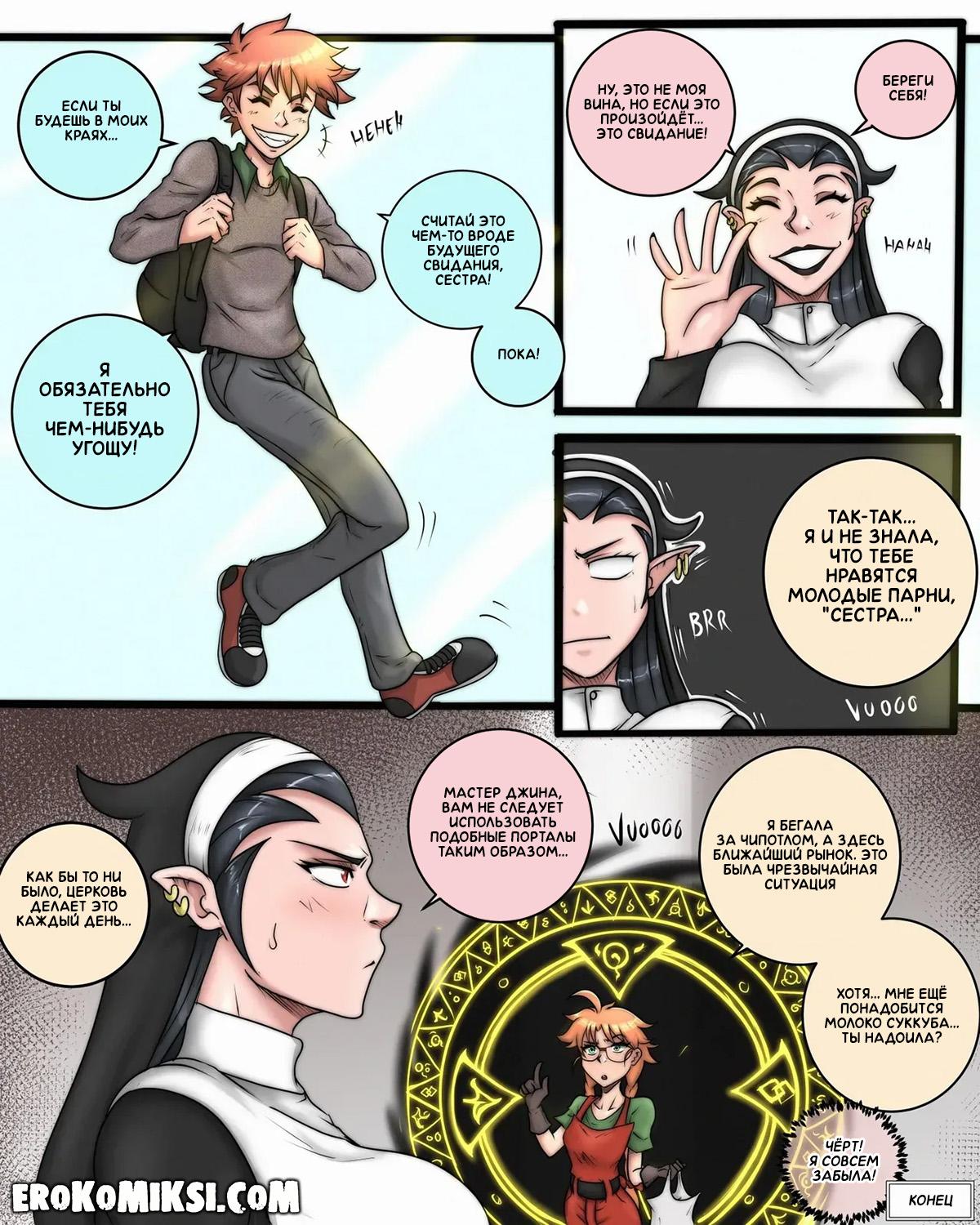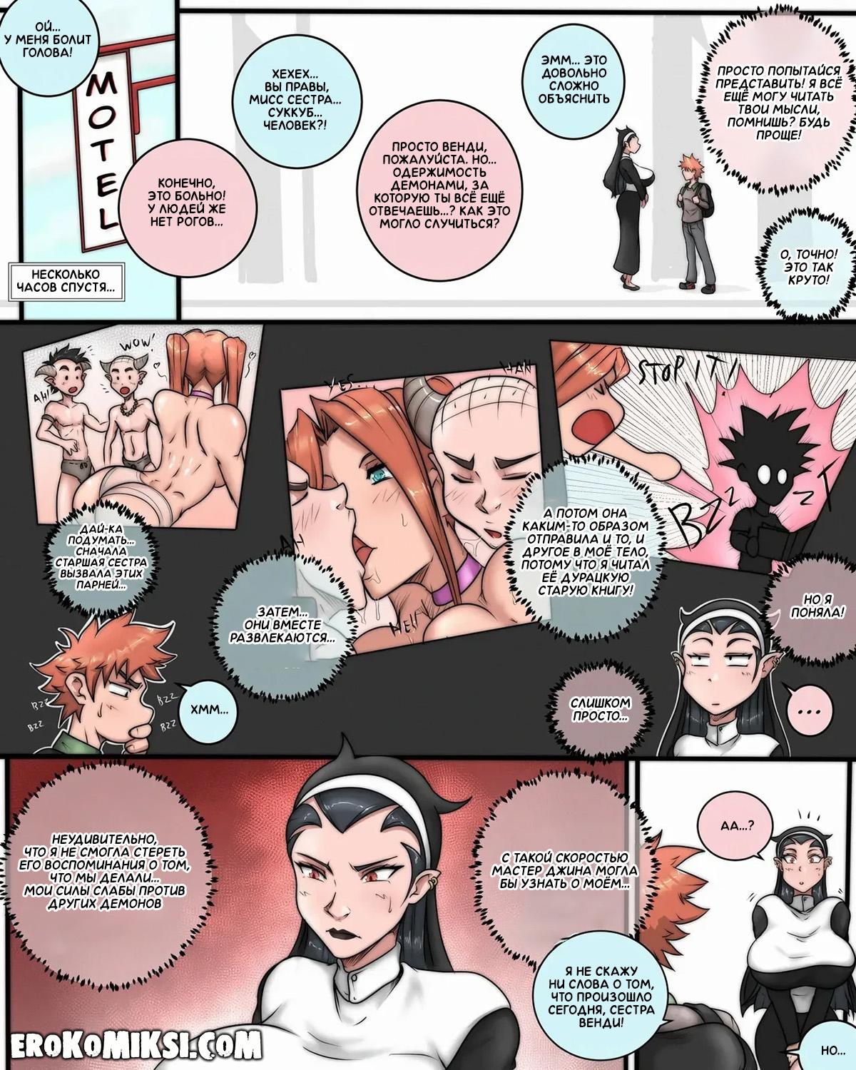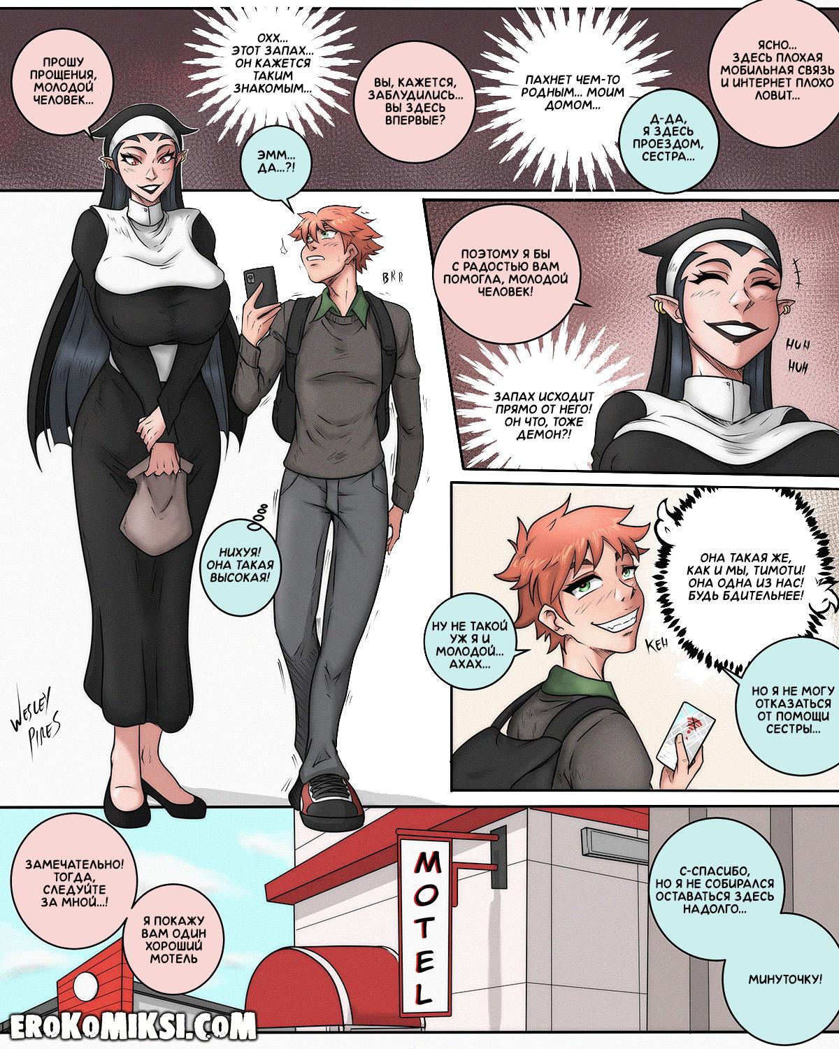 Секс комикс Встреча с Тимом. Монахиня Венди знакомится с заплутавшим парнем по имени Тим, и решает проводить его в мотель, где стягивает с него штаны и видит его огромный член, от которого сразу же возбуждается и принимается его отсасывать…