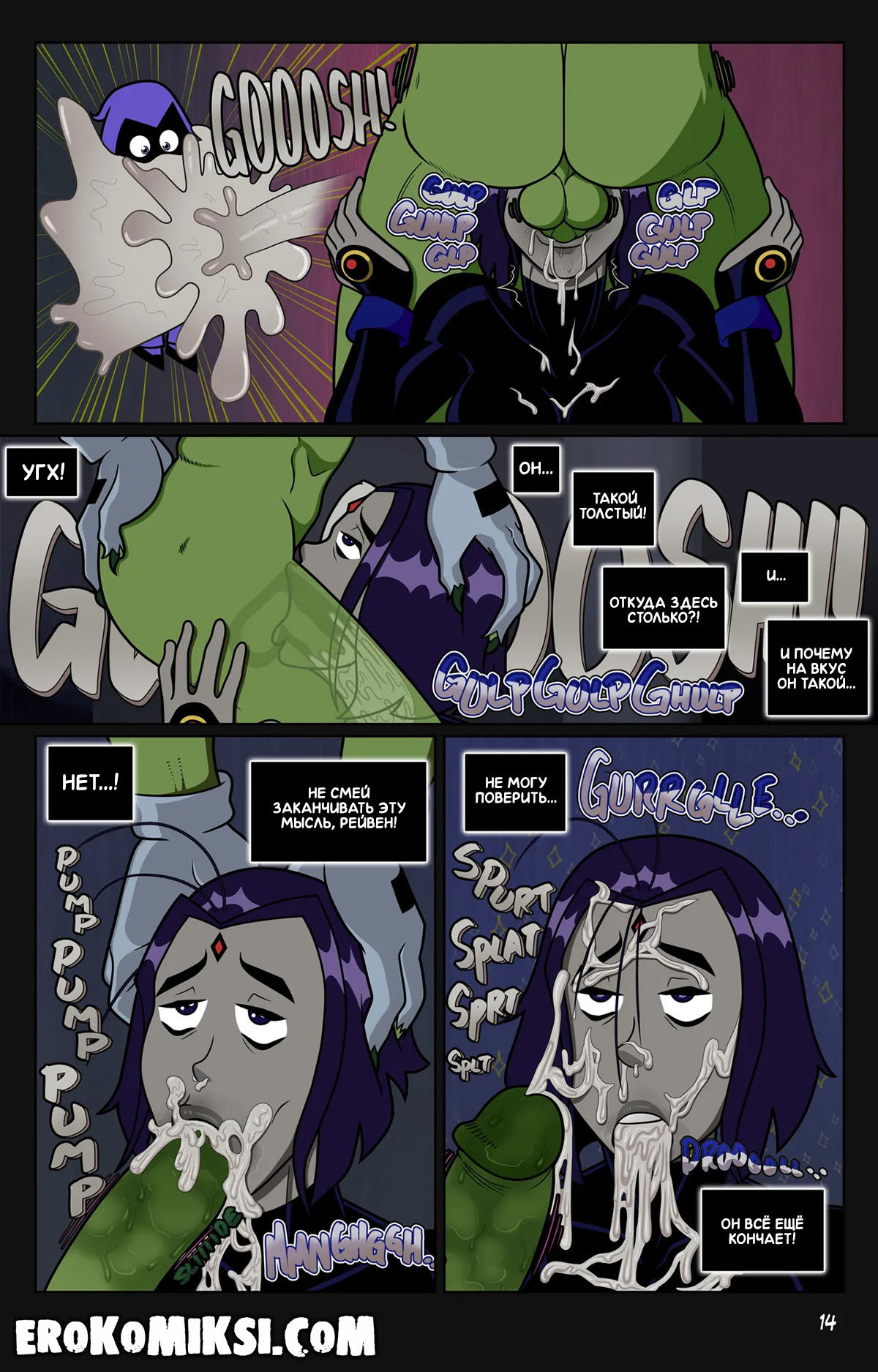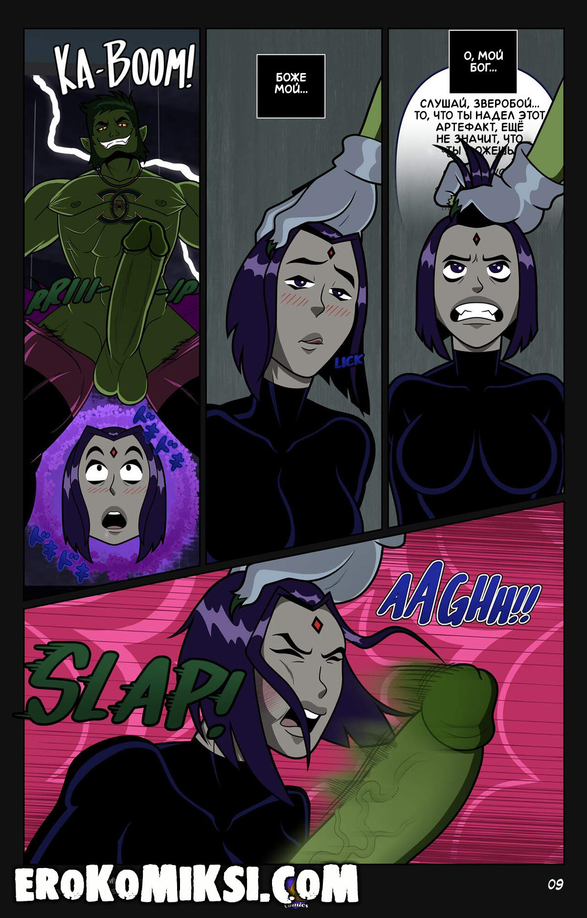 Секс комикс Юные Титаны. Животные Инстинкты. Рейвен спокойно читала свою книжку, как вдруг, появился Зверобой, который сразу же возбудился при виде красотки. Рейвен попыталась использовать свою магию, но всё было безрезультатно, так как Зверобой где-то нашел магическое ожерелье, которое защищает от магии и даёт невероятные силы и усиливает желание к женщинам…
