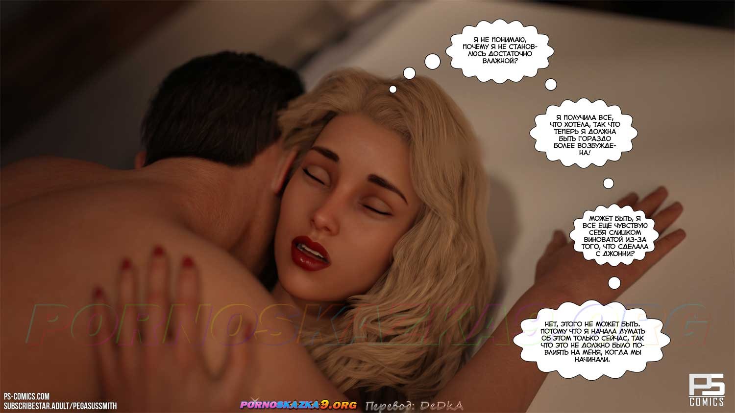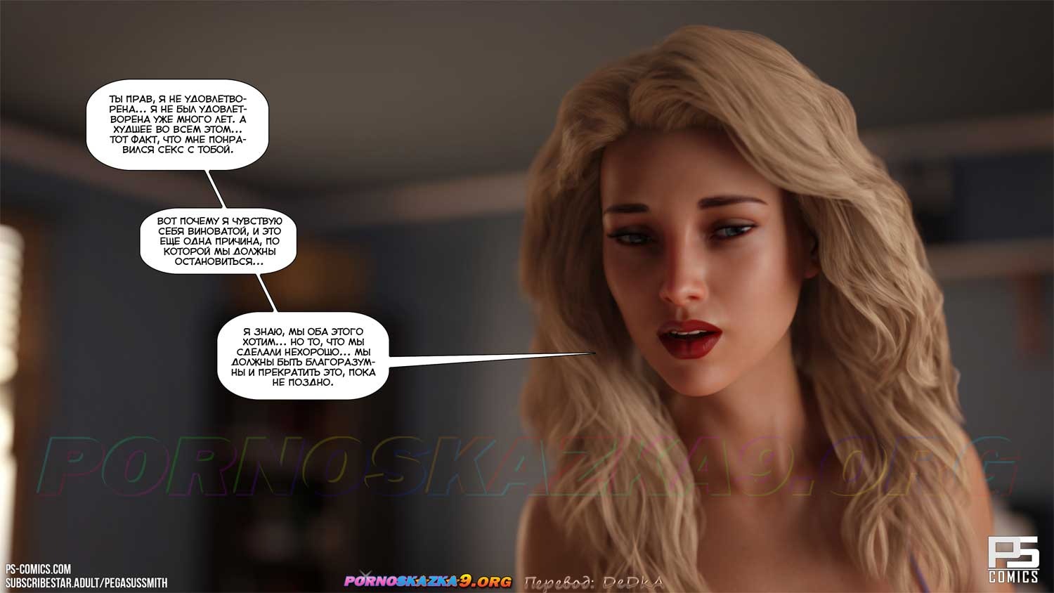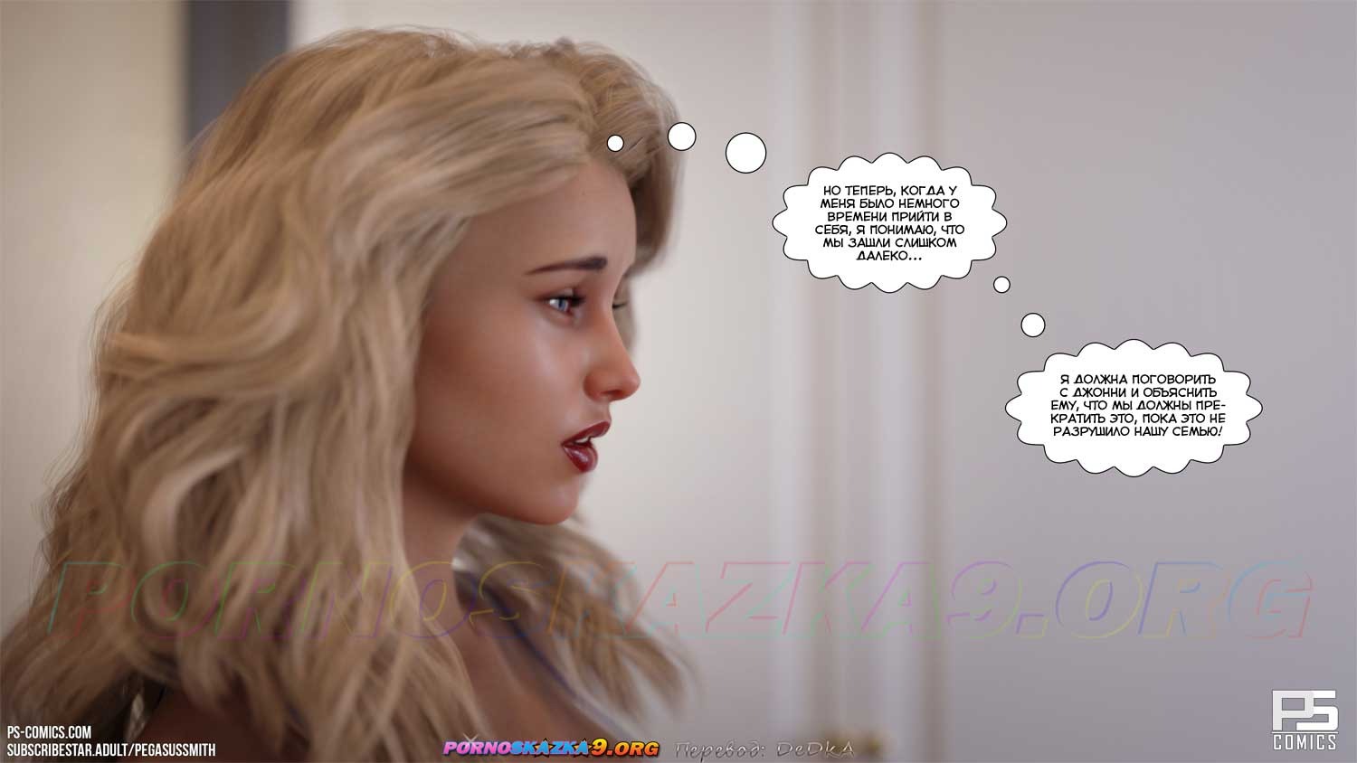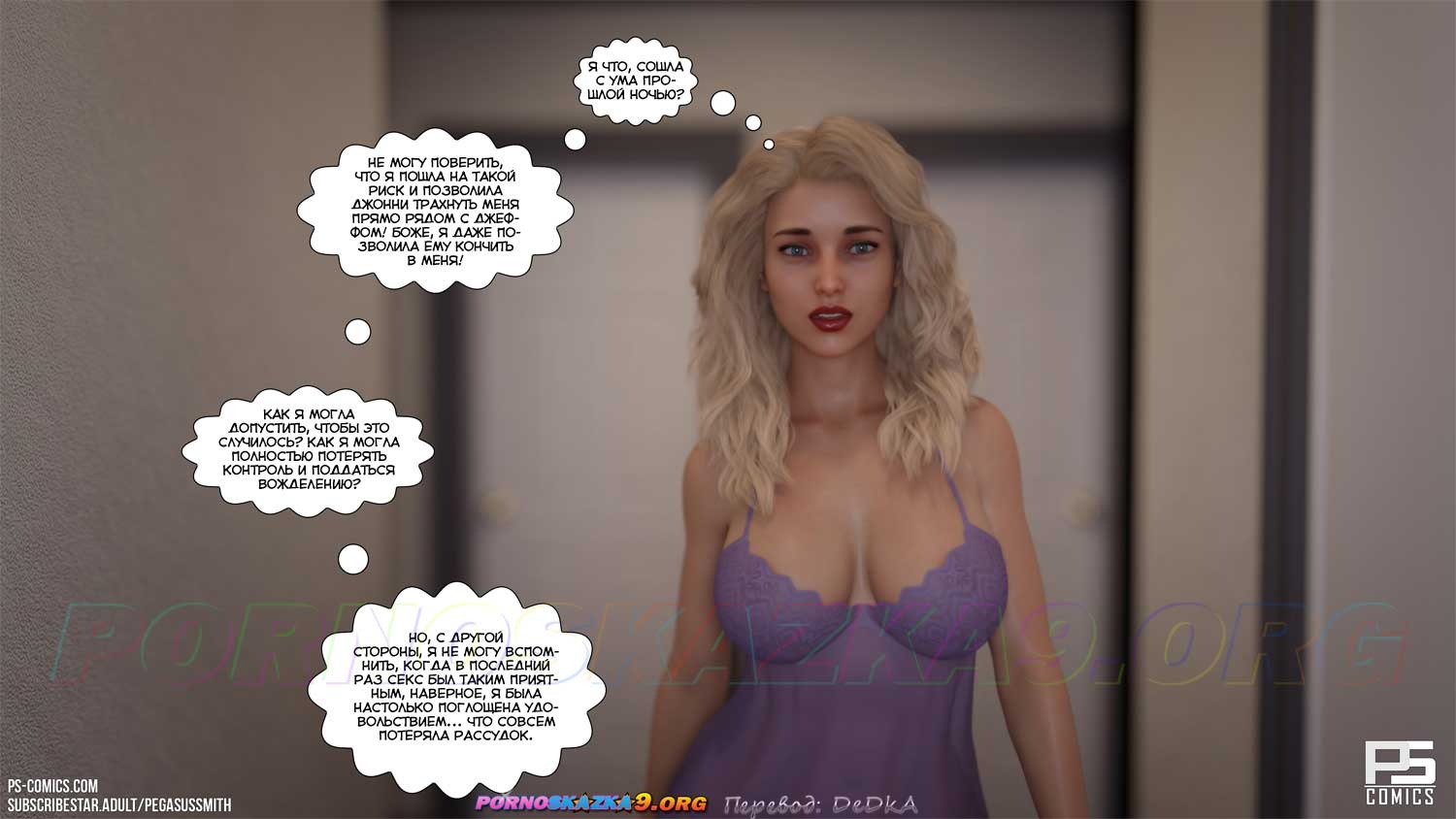 Секс комикс Заблудившиеся в лесу в 3D. Часть 4. Утром Лорен ужаснулась тому, что прошлой ночью ее супруг спал рядом с ней в то время, когда Джонни трахал ее. Это вынудило ее принять решение вообще прекратить секс с Джонни. Решение она приняла, но на самом деле она хочет так все это прекратить, чтобы осталась возможность продолжать… Железная женская логика!