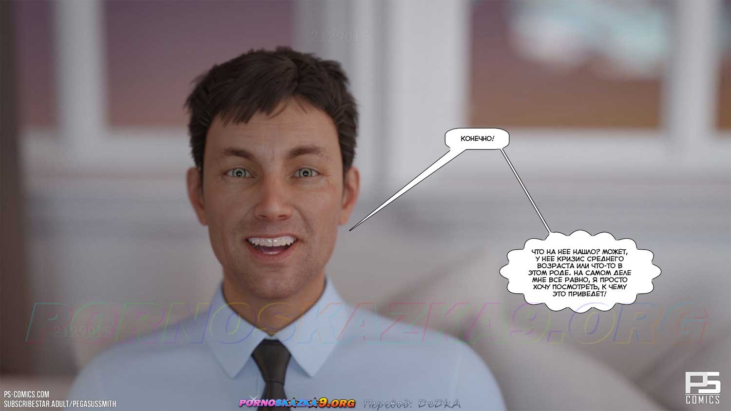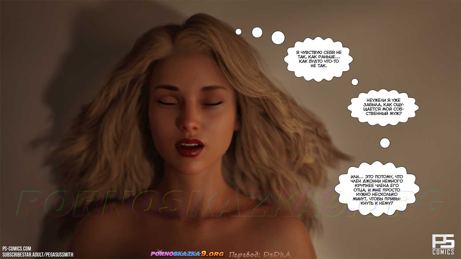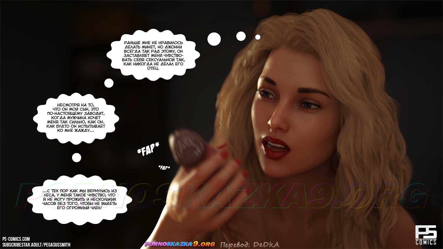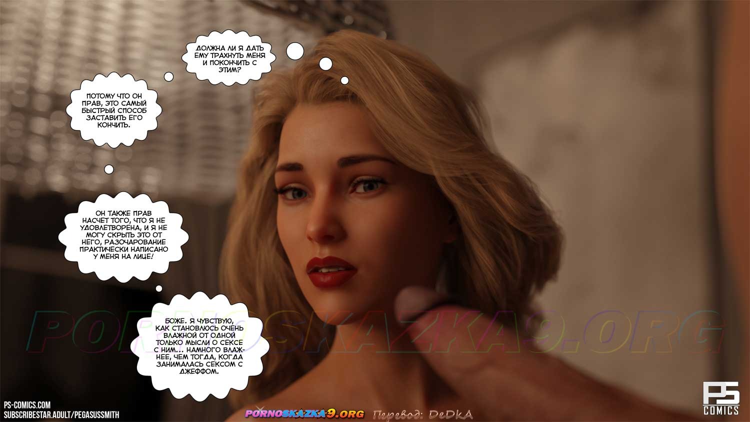 Секс комикс Заблудившиеся в лесу в 3D. Часть 4. Утром Лорен ужаснулась тому, что прошлой ночью ее супруг спал рядом с ней в то время, когда Джонни трахал ее. Это вынудило ее принять решение вообще прекратить секс с Джонни. Решение она приняла, но на самом деле она хочет так все это прекратить, чтобы осталась возможность продолжать… Железная женская логика!
