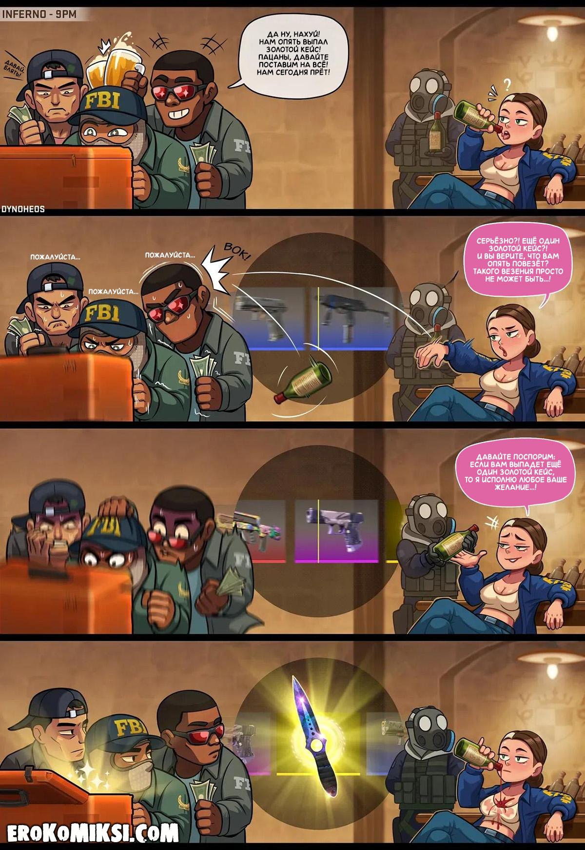 Секс комикс Золотой кейс Авы. Не веря, что парням выпадет ещё один золотой кейс, Ава решила поставить на спор любое желание, в случае их удачи. И удача оказалась на стороне парней, поэтому красавица должна была всё ночь исполнять их желания своими тугими дырочками…